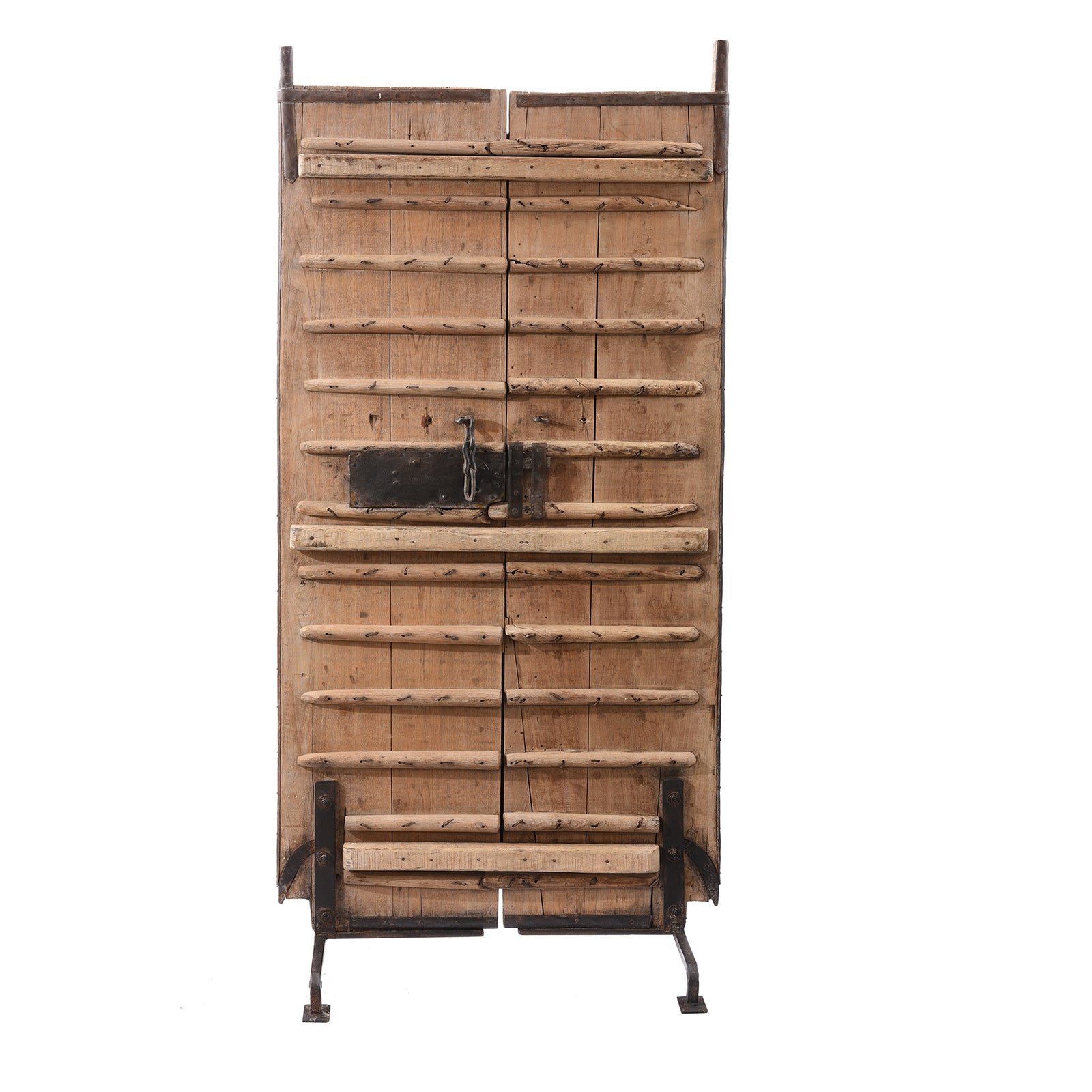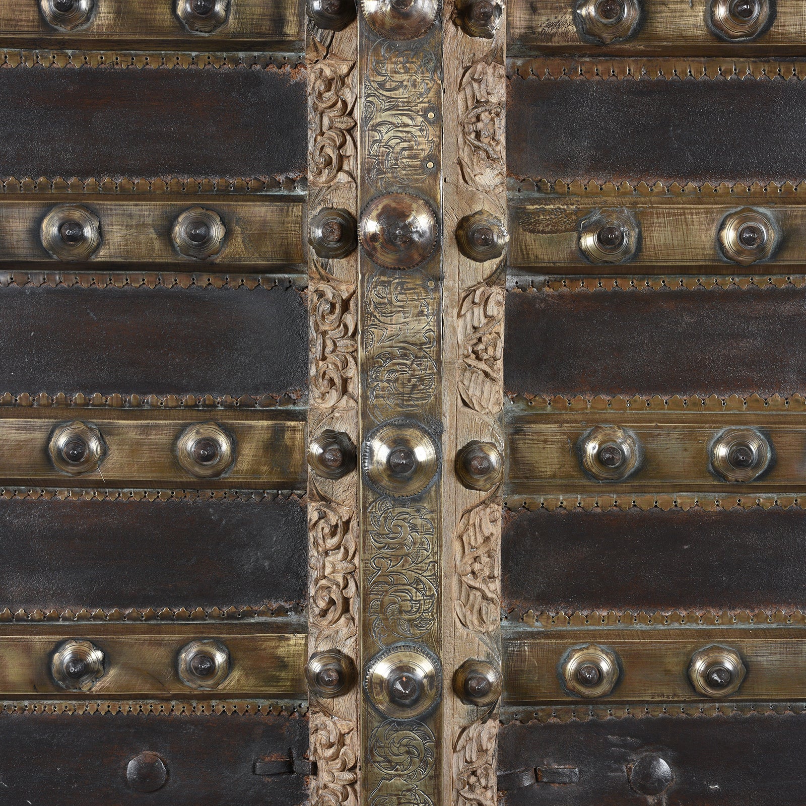 This impressive antique Indian door is bound with iron & brass and dates to the 19th century. Its unique style is only found in Shekhawati in Northern Rajasthan. These doors would originally have had a dramatic door frame and opened inwards on a pillar and post system. The brass features delicately etched acanthus floral designs with the wood carving mirroring this.