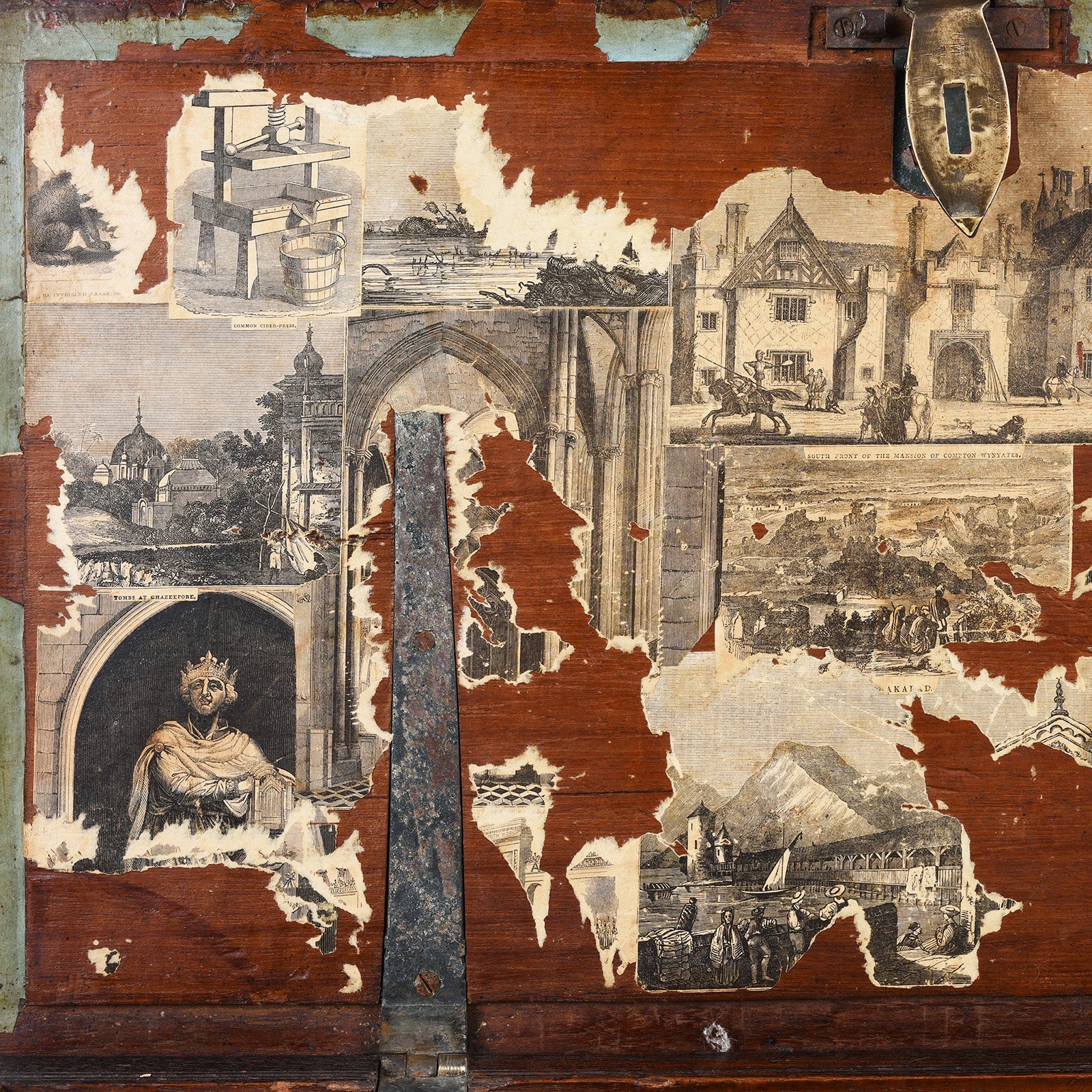 At some point in its life, a previous owner has decorated the inside of the lid with multiple cuttings and postcards adding a further point of interest.