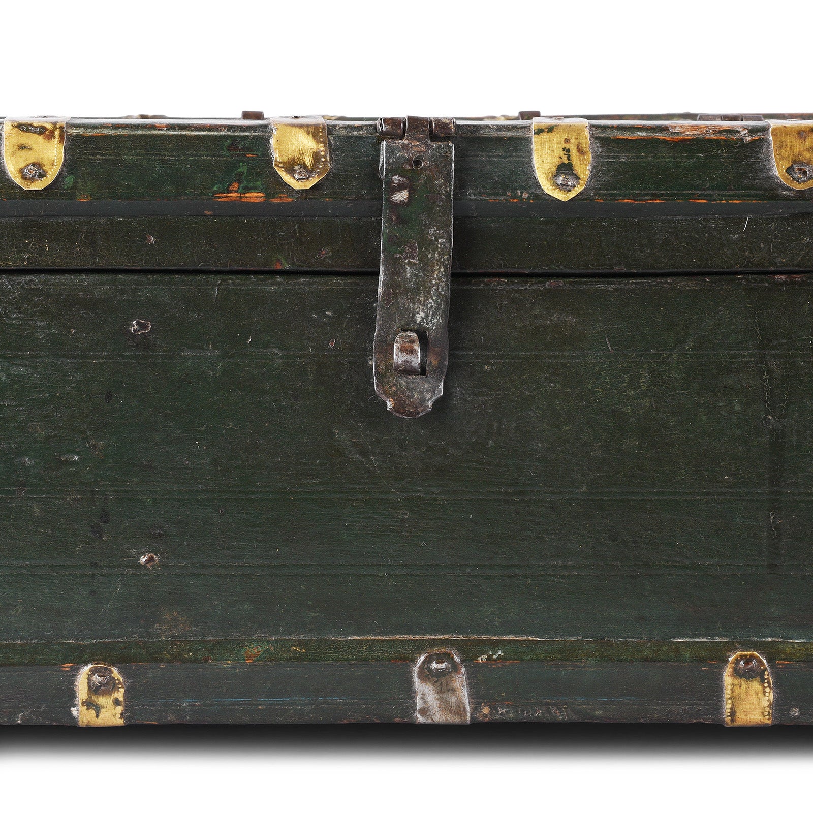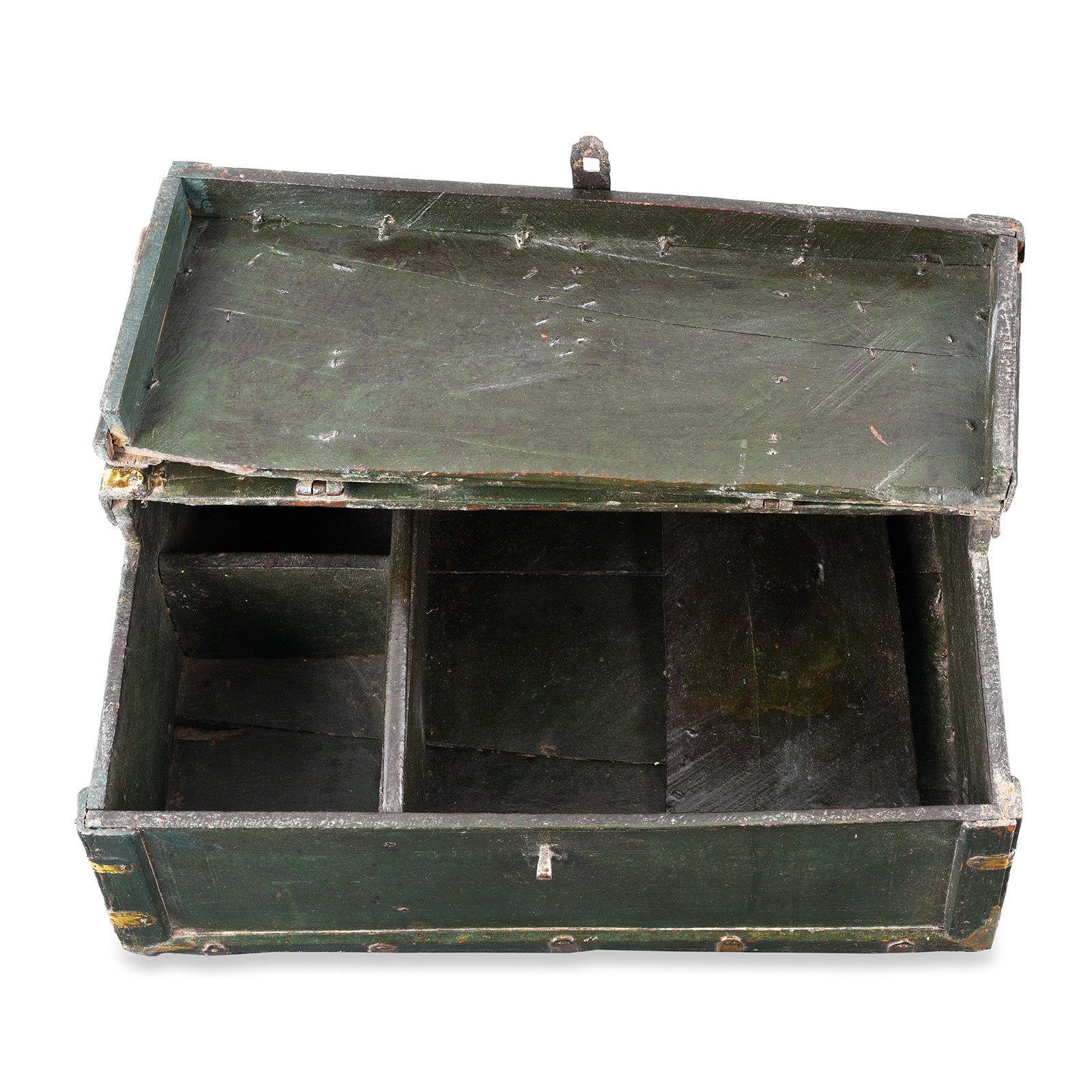 This lovely painted antique Indian box is from the town of Bikaner and has the original metalwork. It is made from roheda wood and dates to the 19th century, and is beautifully bound in hand-forged brass. Unusually its painted in a dark green tone.