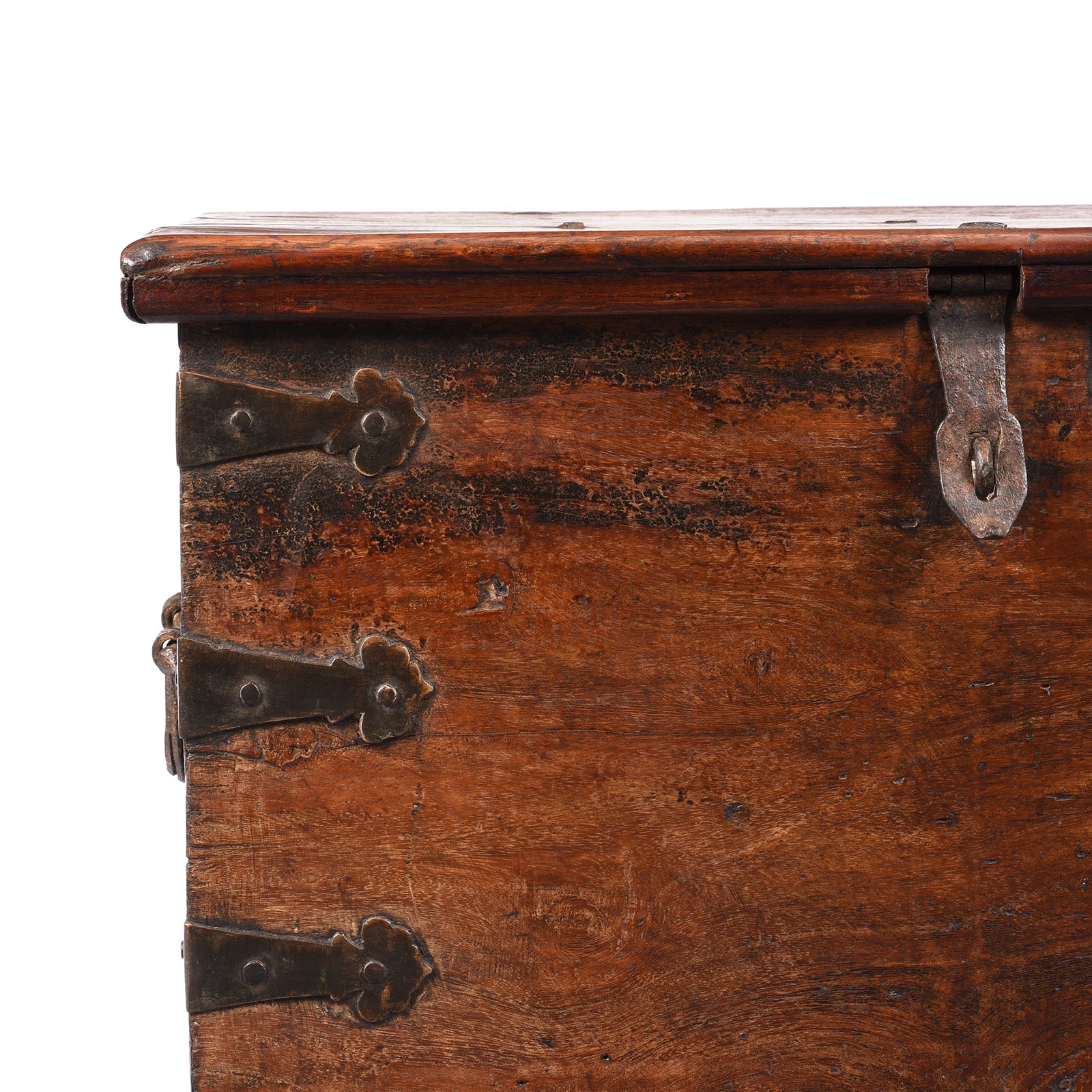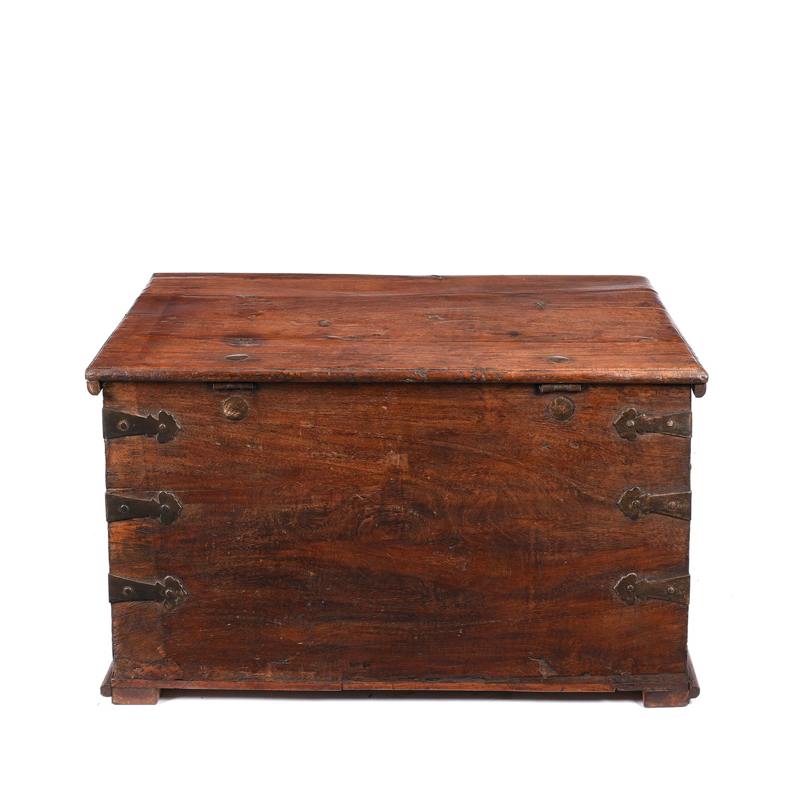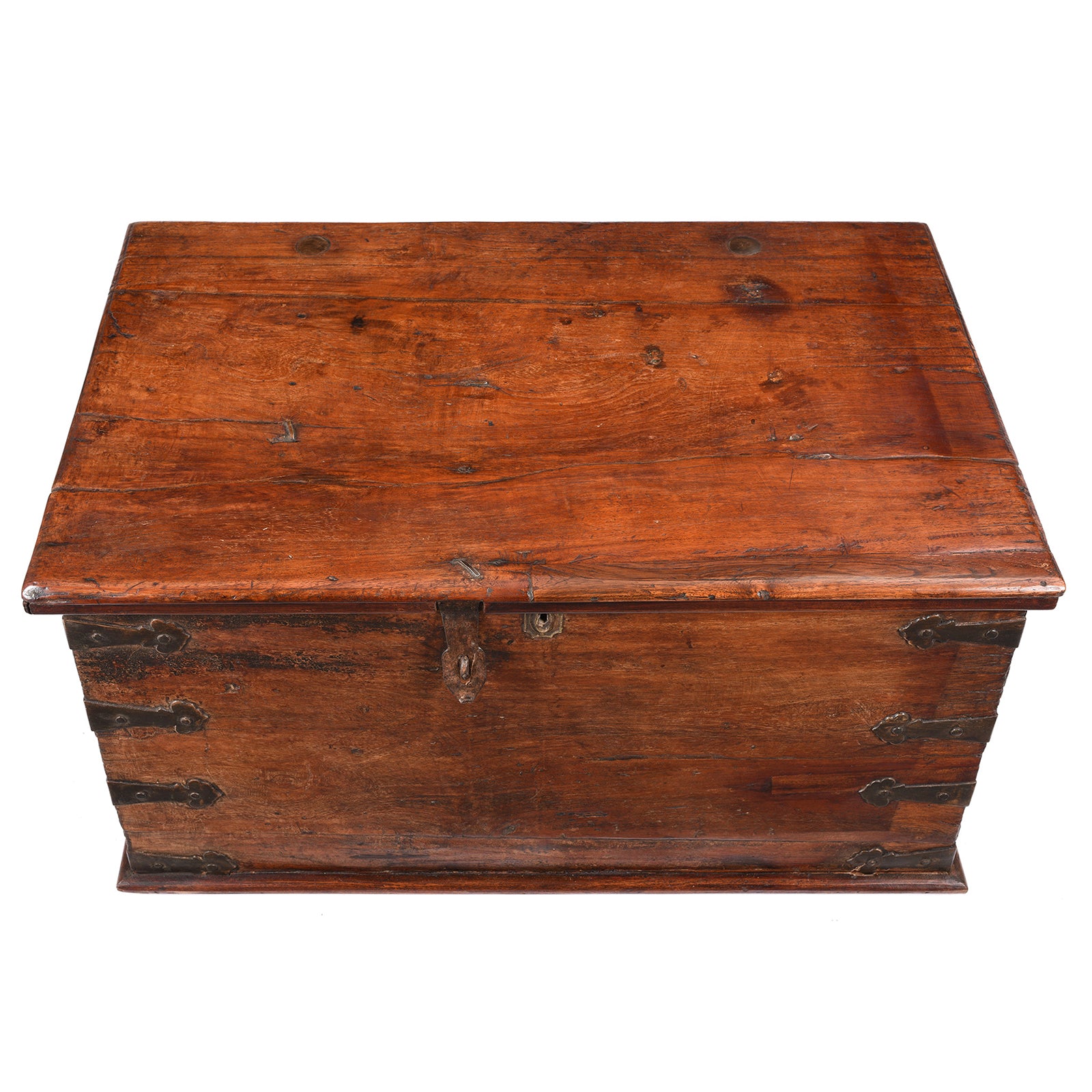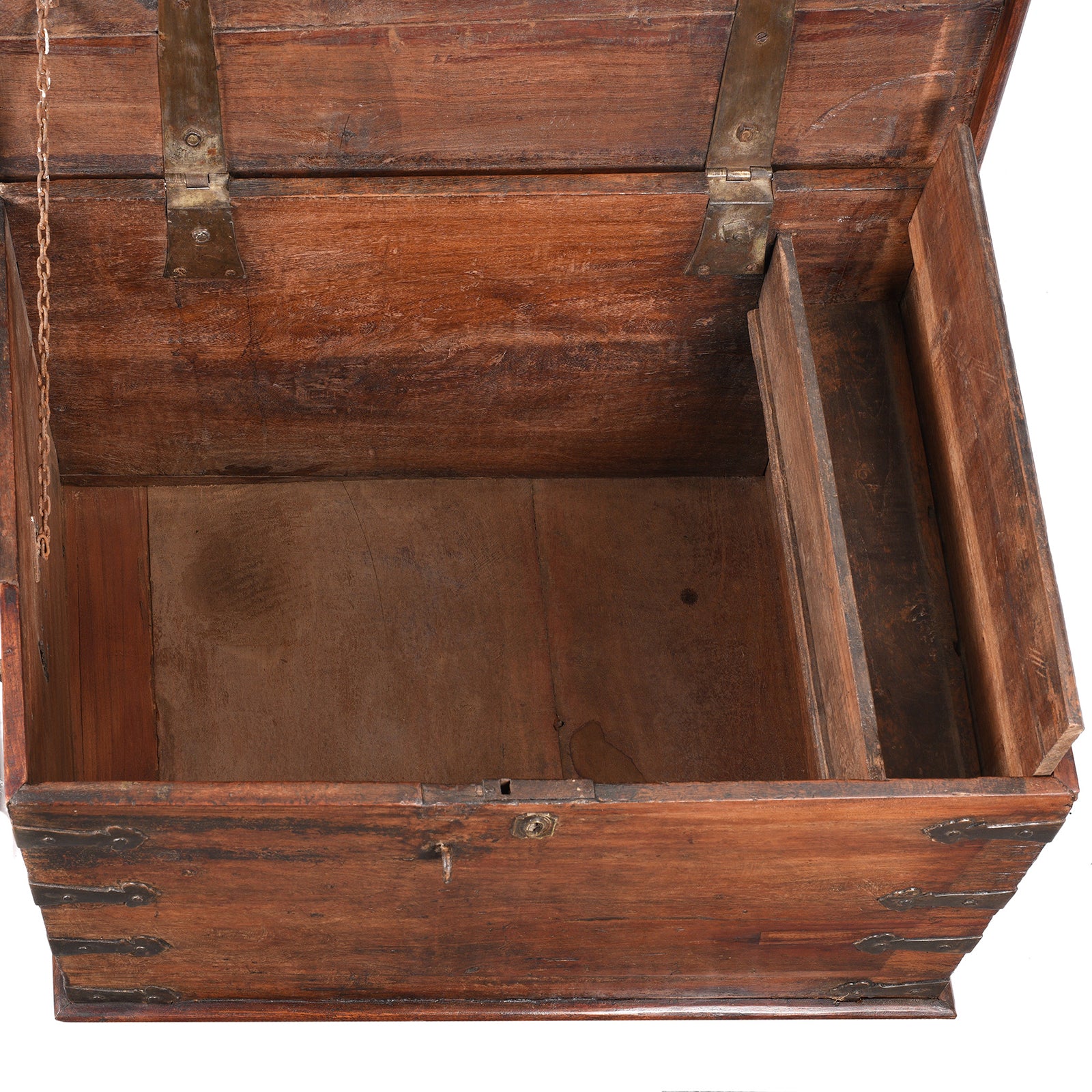 This is a nice early example of a Jackfruit wood Indian storage chest from South India. It has brass corners and hand forged iron lifting handles. The interior is spacious with an internal candle box. A sturdy chain stops the chest lid from falling back straining the hinges.
