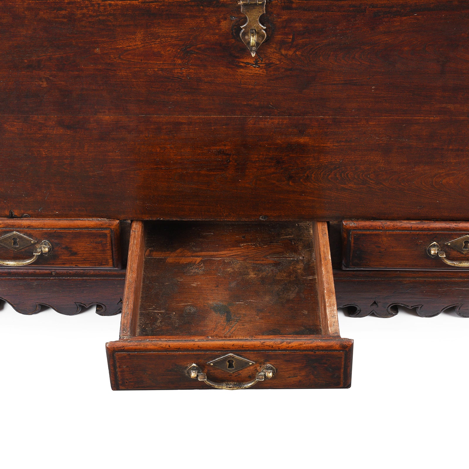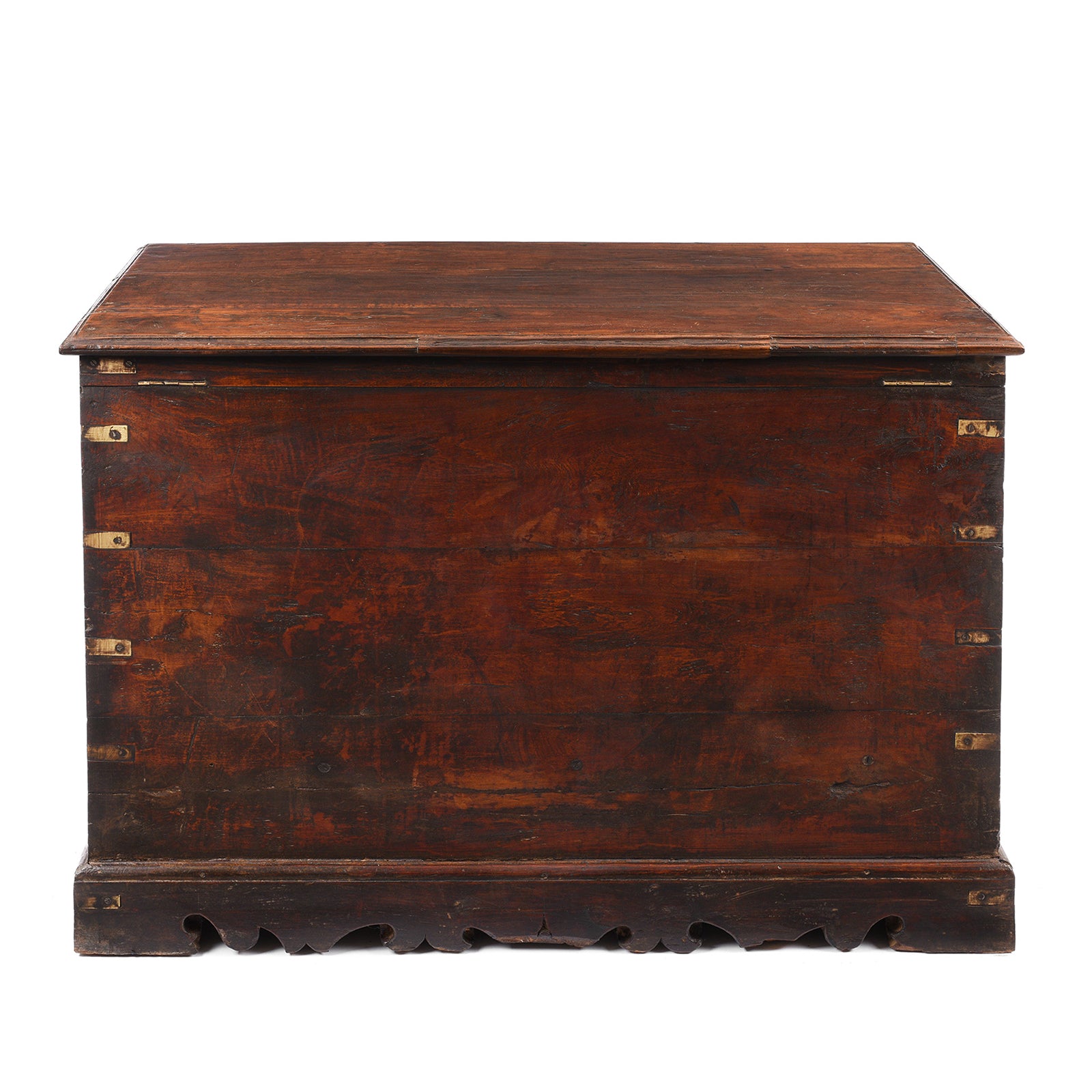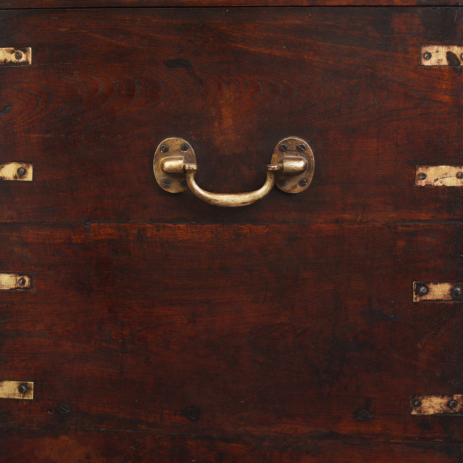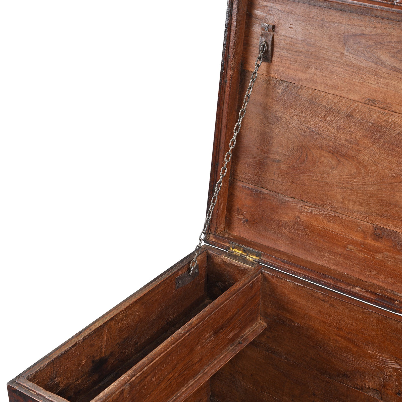This Indian chest is constructed from teak wood and has its original brass fittings and handles. The brass handles on the side are original and are traditionally found on British military chests hinting at who could have been the original owner could have been. A sturdy chain that prevents the lid from falling open and straining the hinges. Chests and boxes from India are found in an extraordinary variety of styles reflecting the many cultures that influenced Indian design.The secret compartment is the most interesting thing about this. When the two left drawers are removed, access to a secret compartment is revealed accessible by a hidden switch at the back of the drawers.