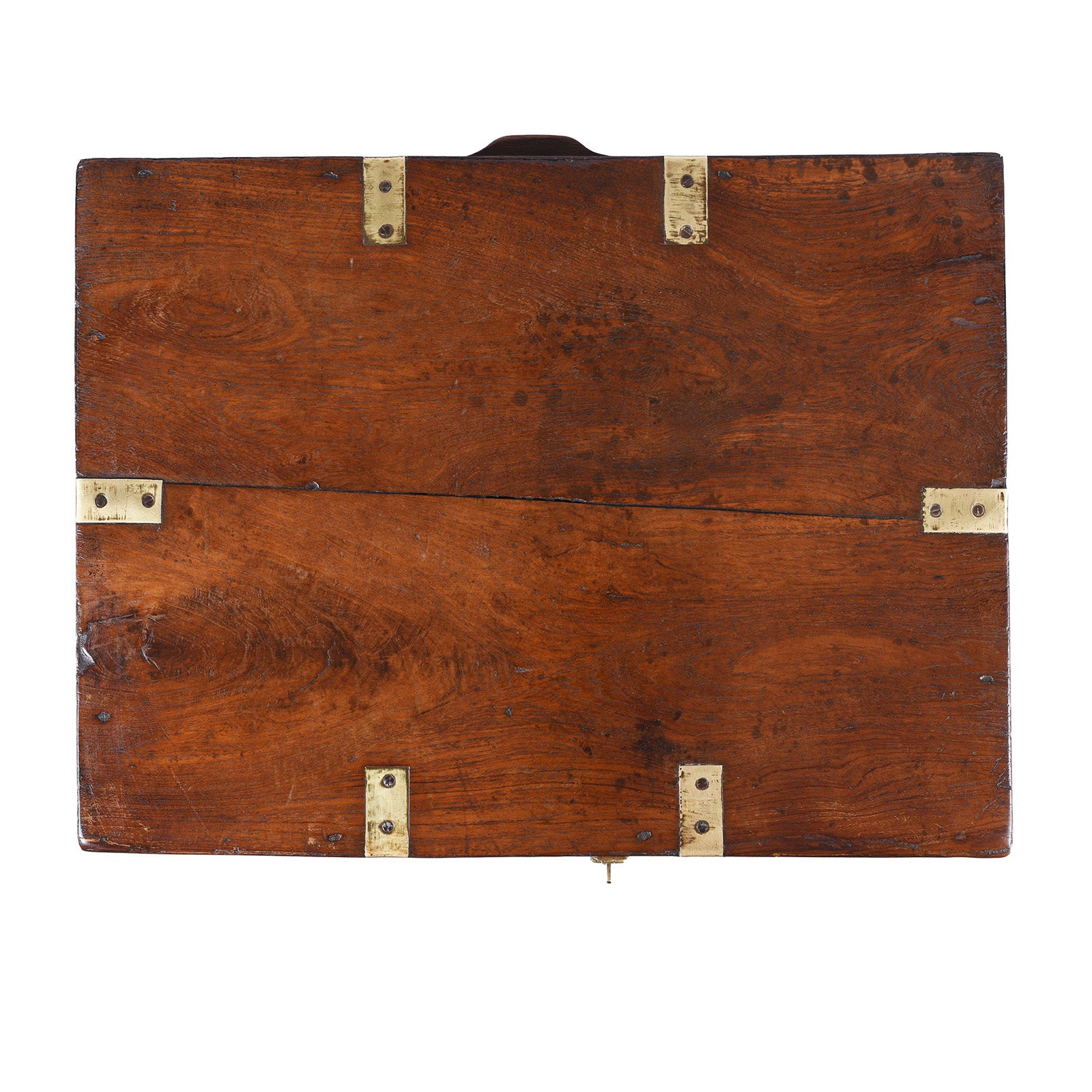 This brass-bound Anglo-Indian military chest dates to the 19th century and is a superb example of campaign furniture made for officers of the British Indian Army. Constructed from beautifully patinated teak, the chest retains its original brass and iron fittings, including strapwork, corner reinforcements, carrying handles, lock escutcheon and latch. The warmth of the timber and the depth of its surface patina reflect decades of use and careful maintenance while travelling between postings.