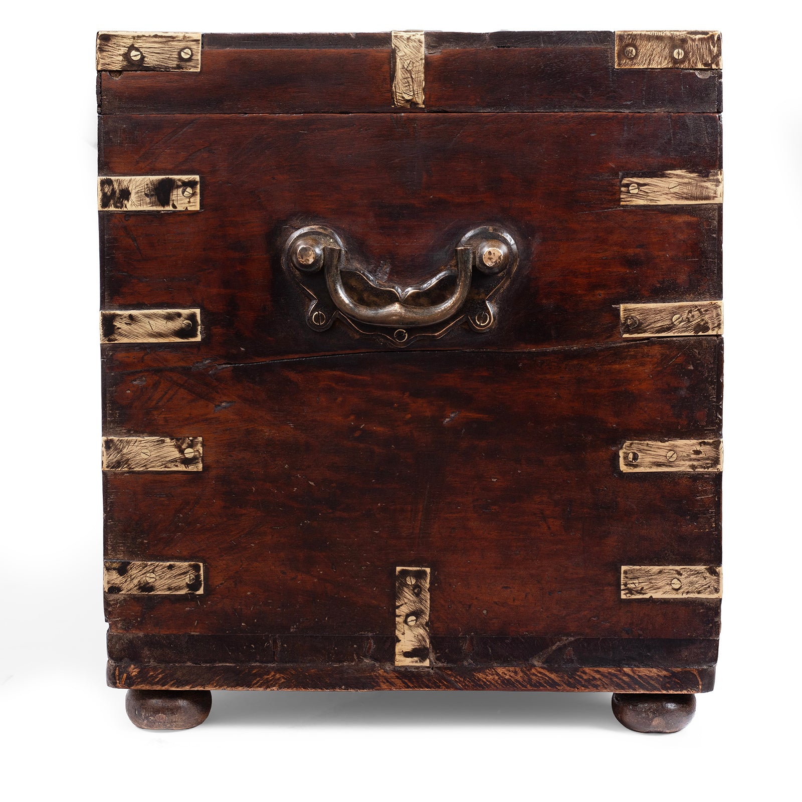 Angled View Of 19th Century Brass Bound Anglo Indian Teak Military Chest With Original Fittings