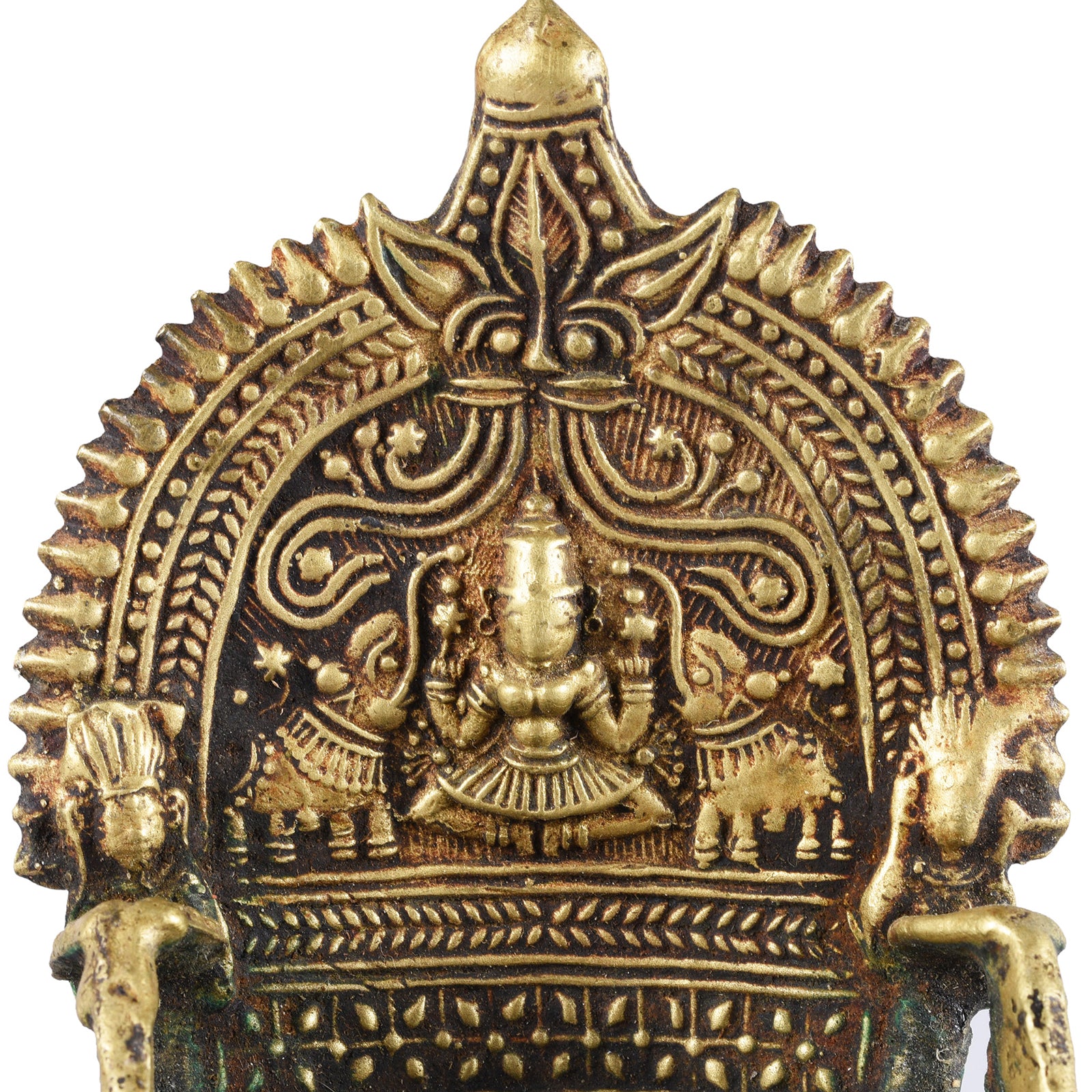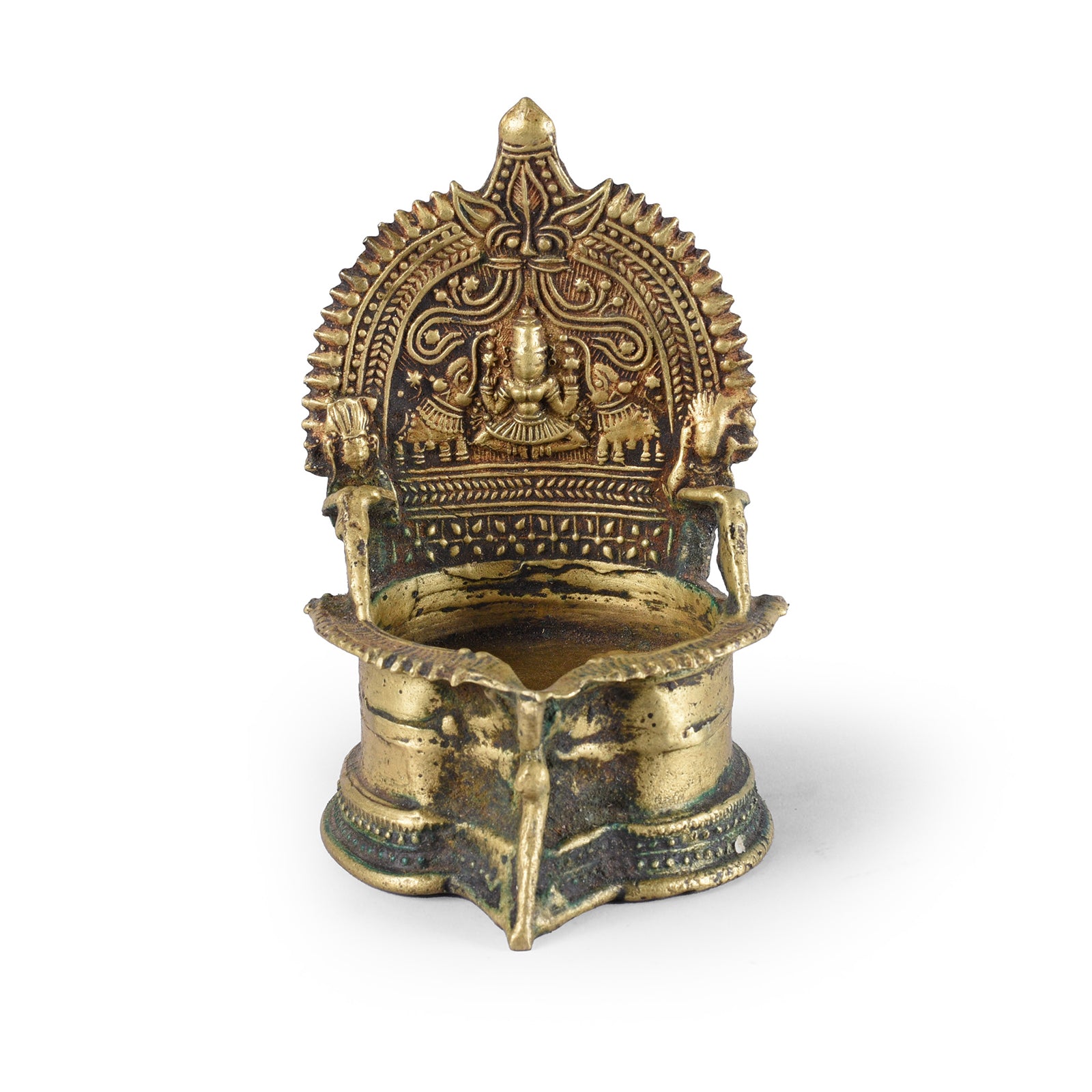 These antique South Indian votive oil lamps are made from cast bronze and originate from Tamil Nadu. Lamps like these are used in a family shrine or Hindu temple. They are called deepa Lakshmi or kamakshi villaku and depict Lakshmi, the goddess of power and wealth on the backplate often flanked by elephants. The design is such that the light honors and illuminates the goddess. A wick would have been positioned in the lip at the front. Each piece is sold separately and may vary slightly from the images shown.