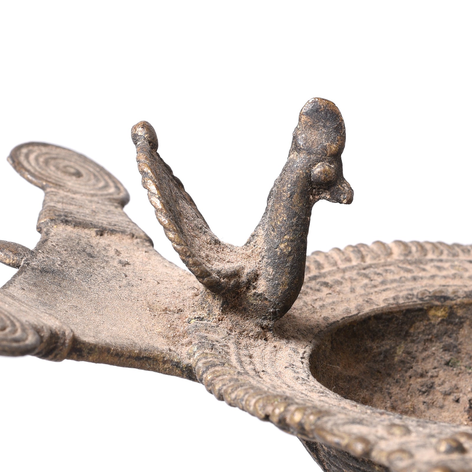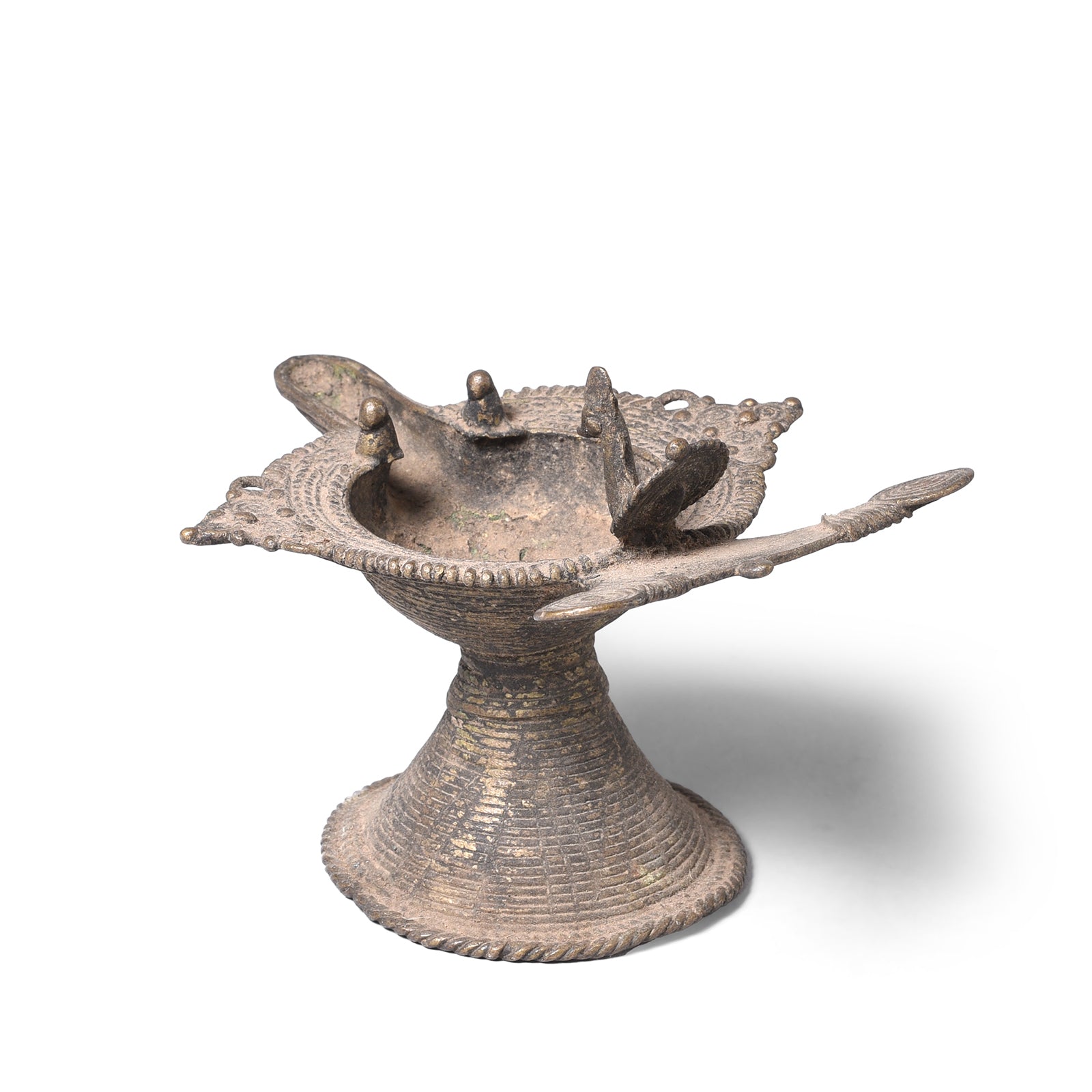 This decorative Indian brass oil lamp is from the Bastar tribes of Chhattisgarh, India. These oil lamps were used daily and would have traditionally been used with a wick and ghee oil. It dates to the early 20th century, circa 1910.