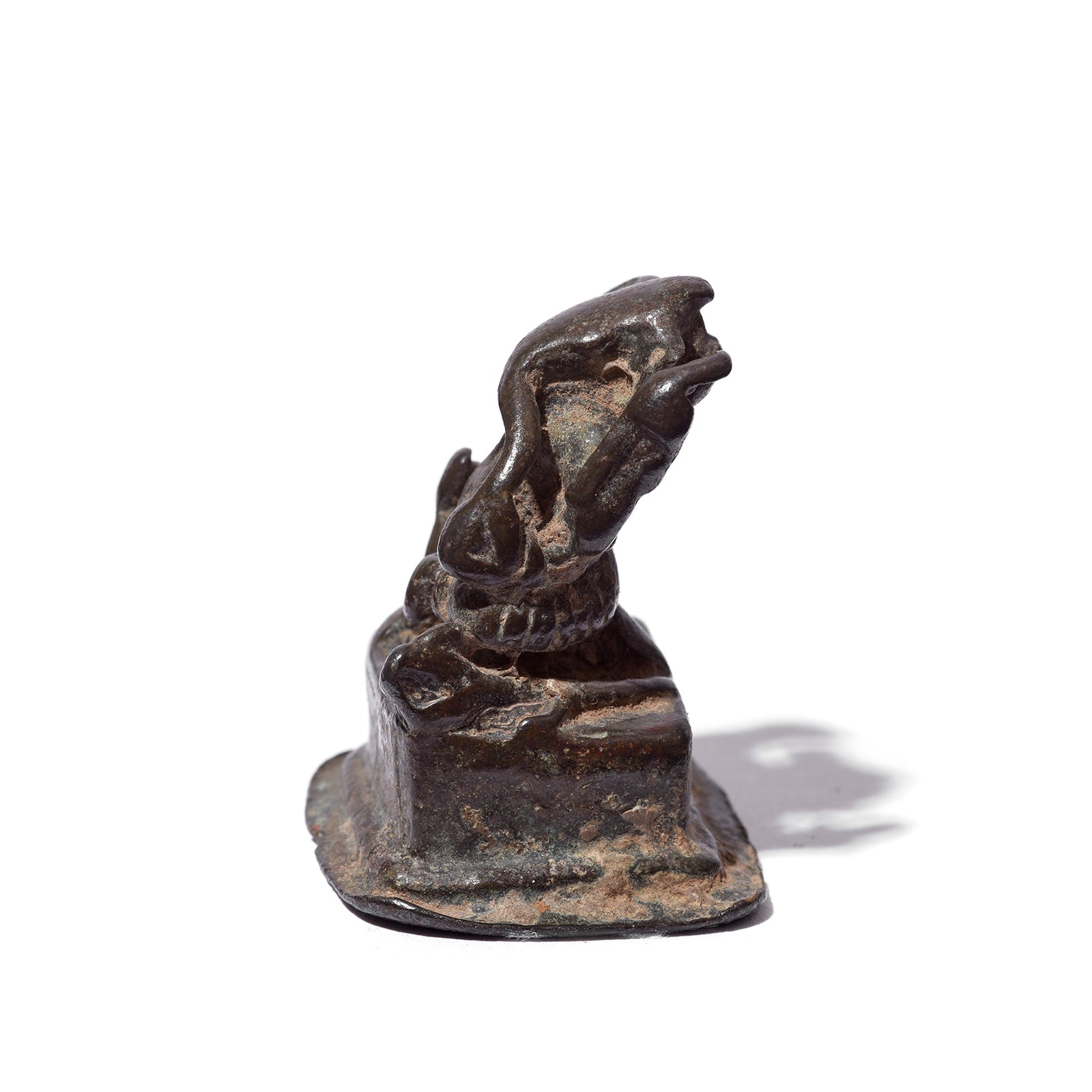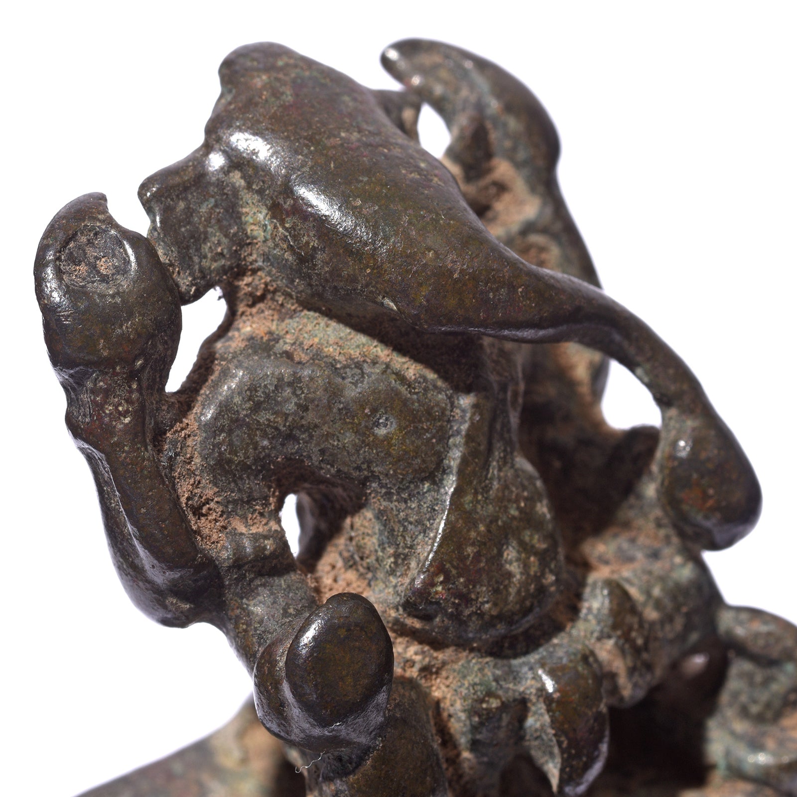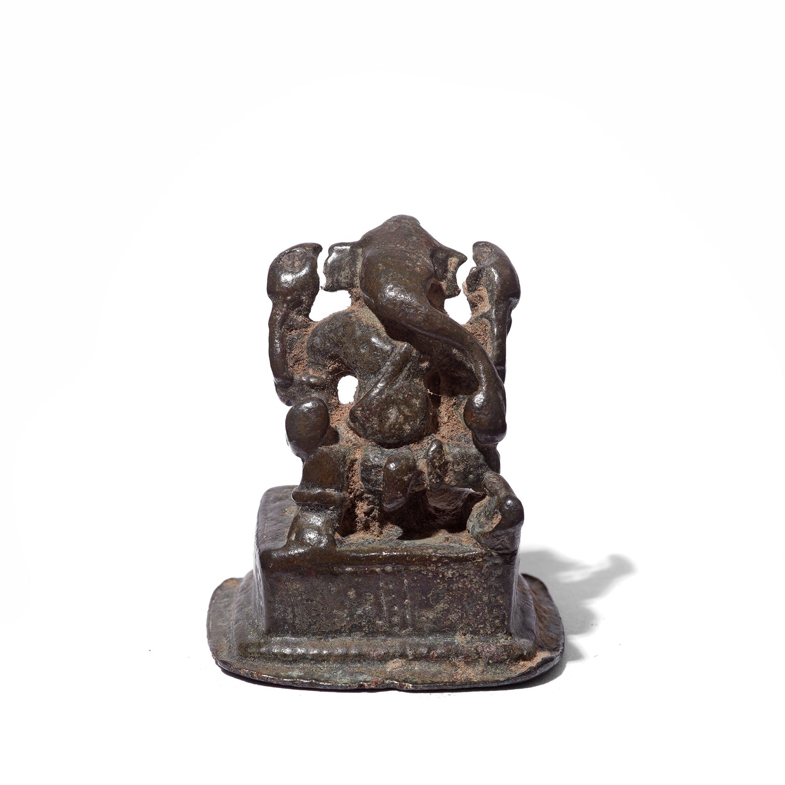 This 18th century Indian brass miniature Ganesh would have been used in personal home shrines. This one appears to come from Andhra Pradesh. It has been used heavily in puja casing heavy wear and smoothing to the one defined features.