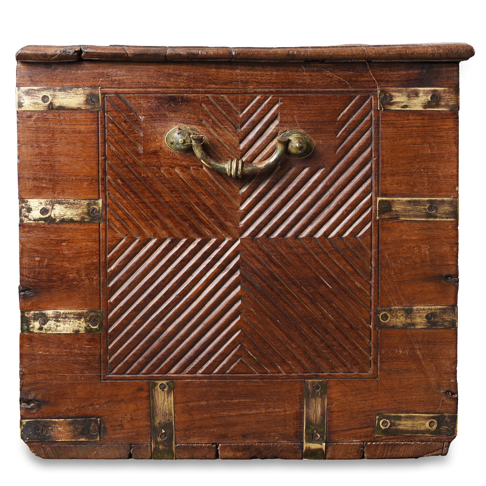 Although a Malabar chest in name, this style of chest was likely made in Kutch in Gujarat. The carving is heavily influenced by the Portuguese style.