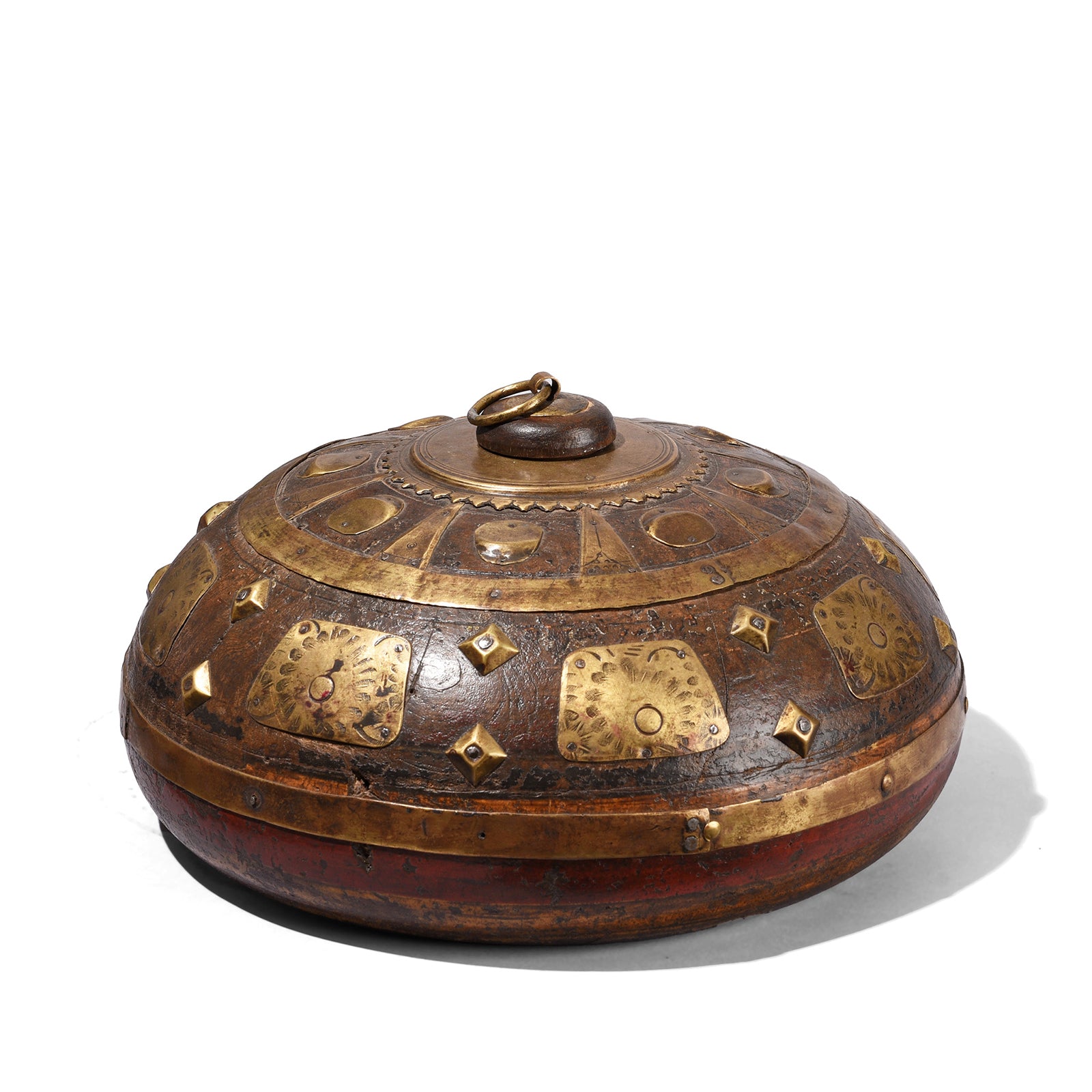 This style of Indian pot was used for tobacco and opium. These pots were in constant use. This piece dates to 1910 and has been beautifully constructed using a single piece of teakwood which has developed a great patina with age. The exterior of this box has been decorated with brass studding.