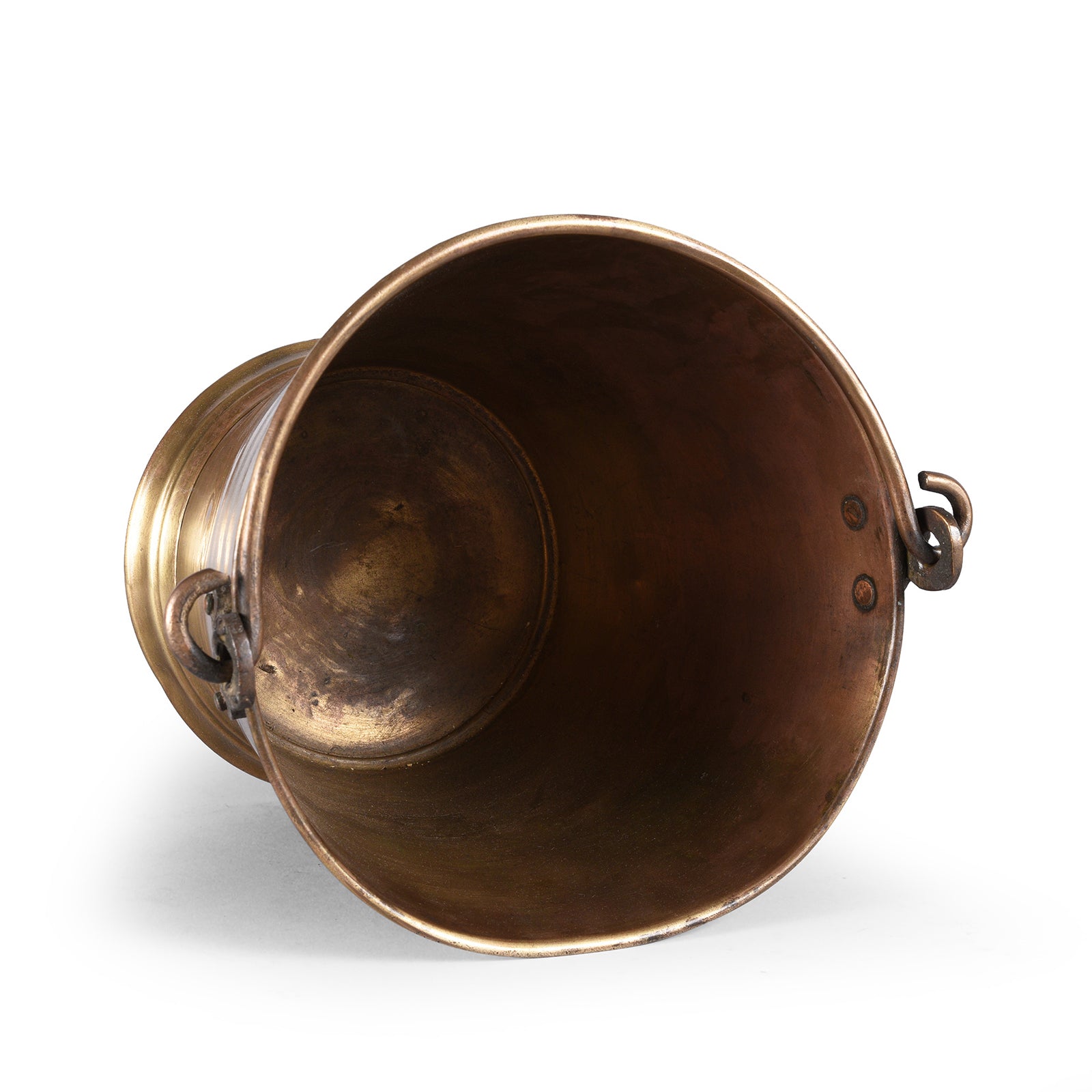 - Features: Rolled rim, flared base, incised rings, riveted swing handle
