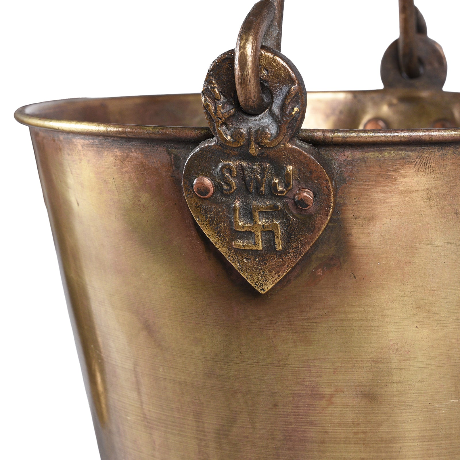 This old brass bucket carries layers of history, both utilitarian and devotional. Stamped on the handle lug with the maker's mark S.W.J. above a swastika symbol, it reflects the Indian use of the swastika as an ancient emblem of good fortune and prosperity. Constructed from heavy-gauge brass with copper rivets and a rolled rim, it belongs to the robust tradition of so-called 'campaign buckets,' widely used in India during the 19th and 20th centuries by armies, municipalities, and temples alike.
