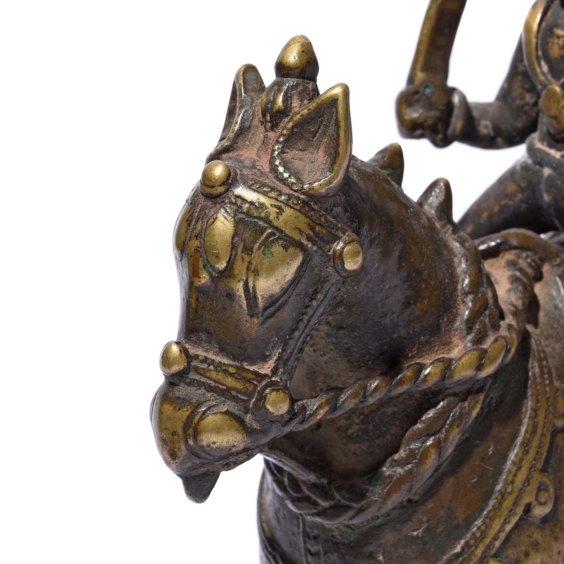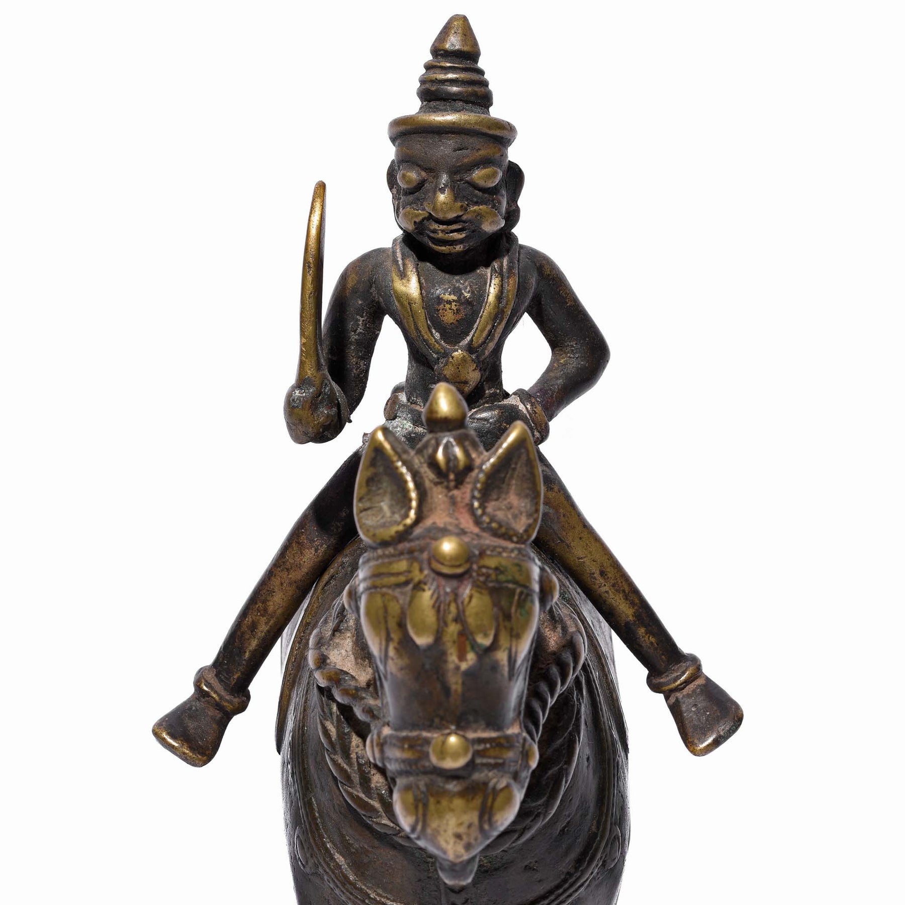 This Indian cast bronze figure of Khandoba on horseback dates to the 18th century - possibly 17th century. It is from Maharashtra or Karnataka. Khandoba is a warrior manifestation of Shiva most often worshipped in central and southern India. He is worshipped as Mallanna in The Deccan, & Khandero in Rajasthan.