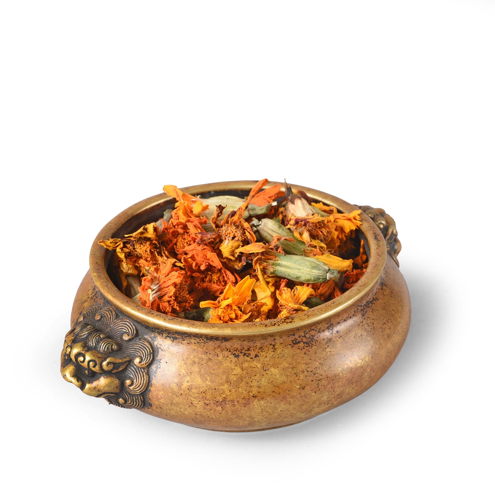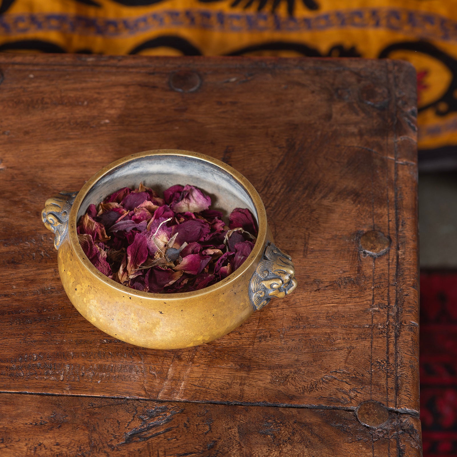 This beautifully patinated burner has the appearance of years of use. It is a heavy-duty burner that will last for generations, adding a touch of elegance to your home. It can also double as a small keepsake pot or a pot for dried flowers.