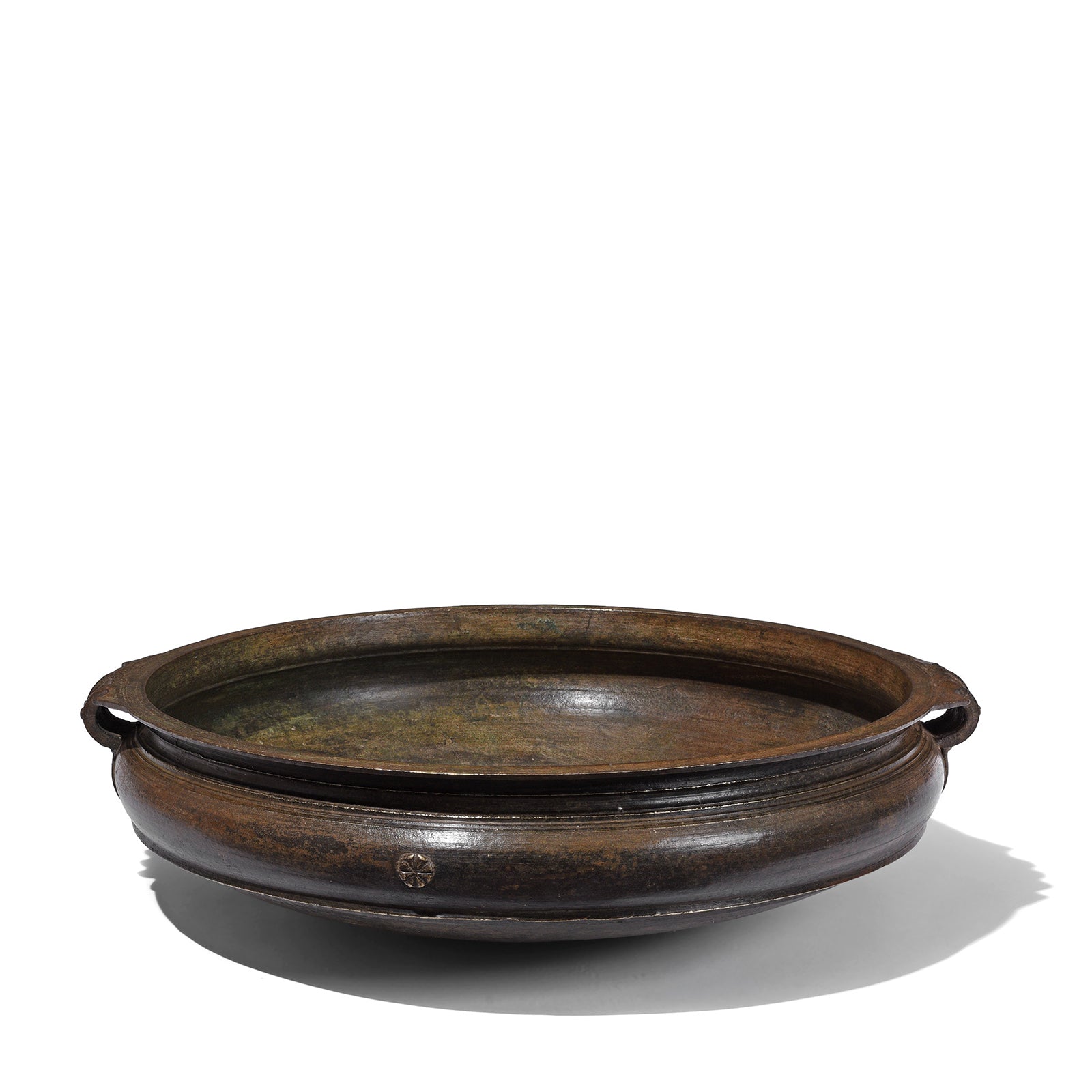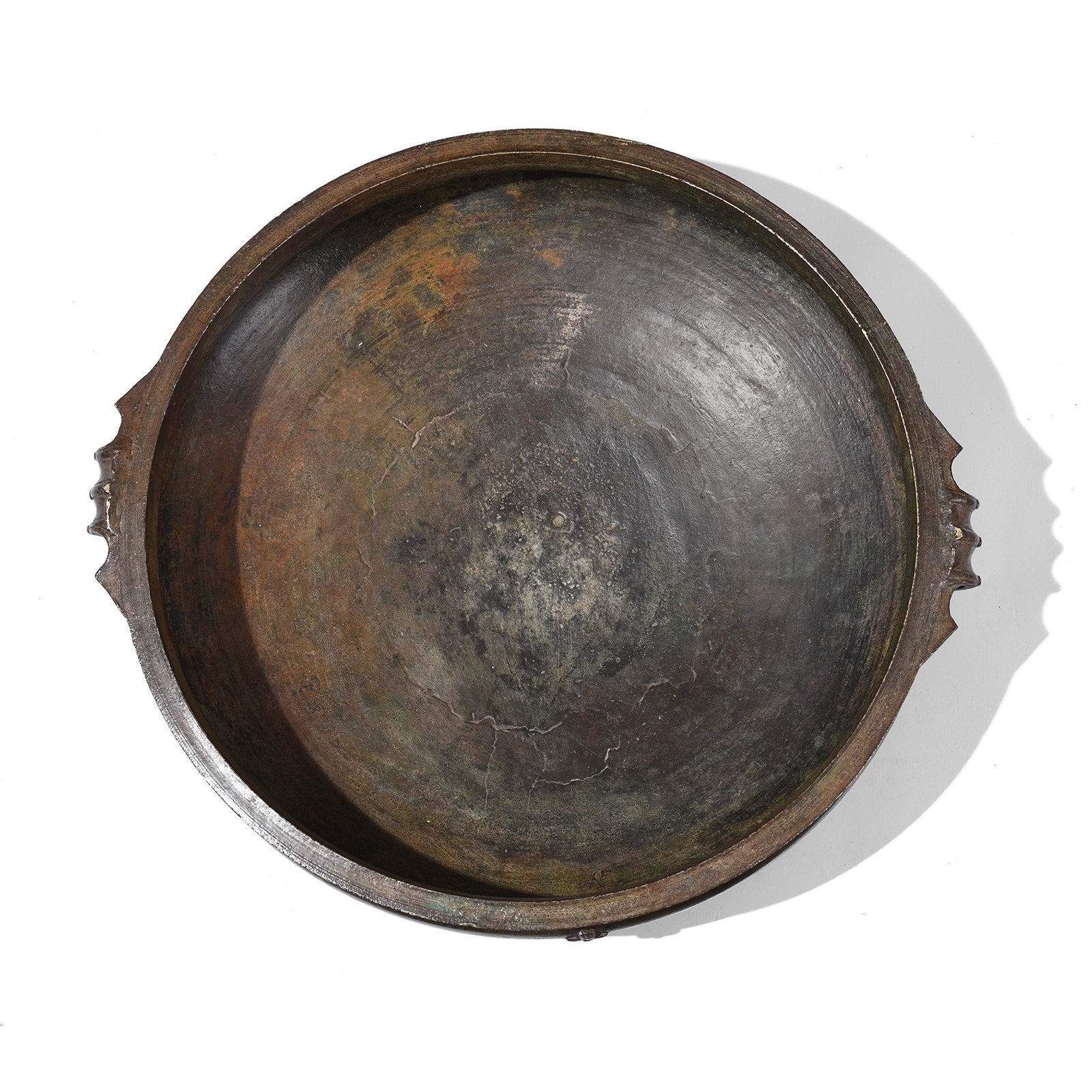 Crafted in South India in the late 19th century, this impressive bronze cauldron is known locally as an Urli (ഉരുളി). Traditionally used in Tamil and Malayali households for cooking large quantities of food, Urlis were placed directly on an open flame and carried with the aid of wooden poles threaded through the robust loop handles. This piece tells a story of communal gatherings, ritual cooking, and time-honoured technique.