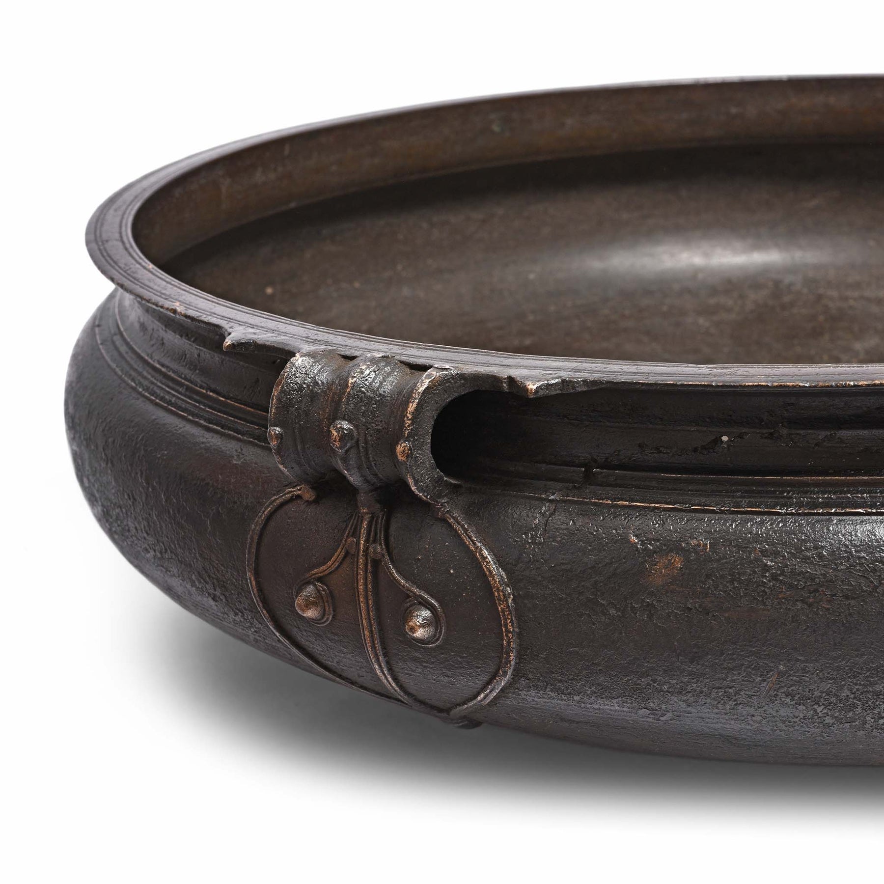 This bronze Indian cauldron from South India is called an Urli and it dates to the late 19th century. Urli's ( ഉരുളി ) are cooking vessels used as cauldrons for food preparation in Kerala, South India. Also called uruli or charakku, these cauldrons were used in both Tamil & Malayali homes and could hold vast amounts of food. They were placed directly on the fire and wooden poles were inserted through the loop handles at each side to carry them.
