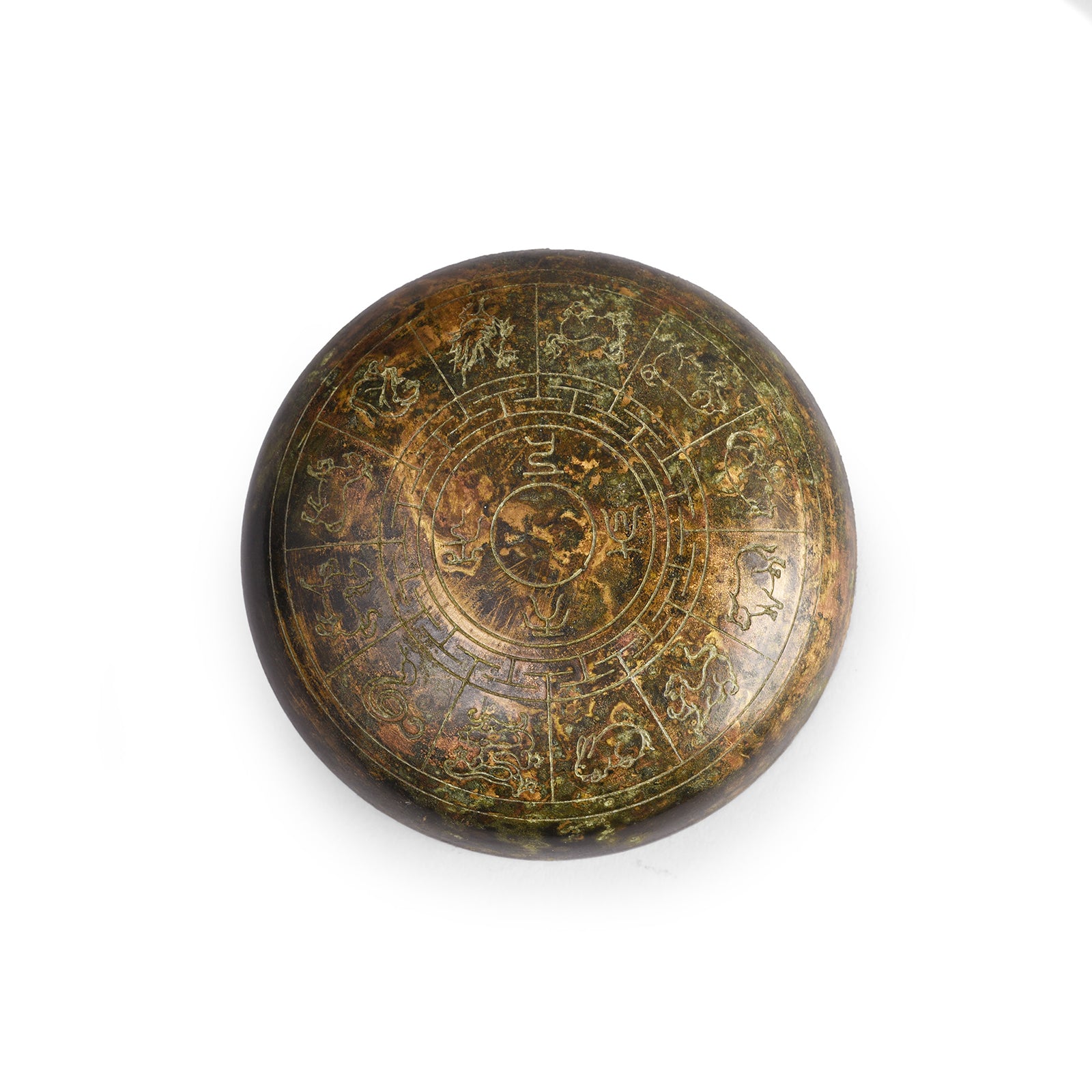 This bronze trinket box has the signs of the Chinese zodiac engraved on its wonderfully patinated surface. Although not old, this piece has been made using traditional techniques.