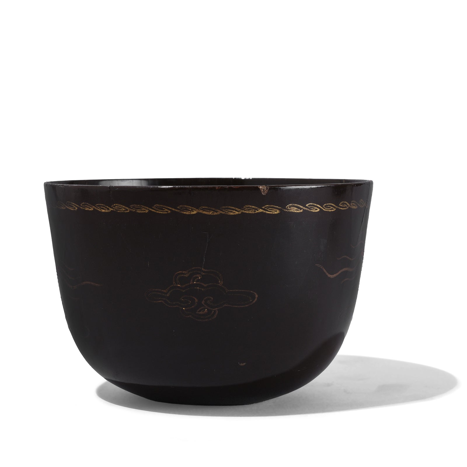 This fine Burmese lacquer tea cups were made in Burma in the early 20th century specifically for the Chinese market. The exterior is beautifully decorated with a gilded five-clawed dragon, a potent symbol of imperial power and good fortune in Chinese culture. The dragon’s dynamic form, swirling amidst stylised clouds, contrasts elegantly against the deep black lacquer ground.