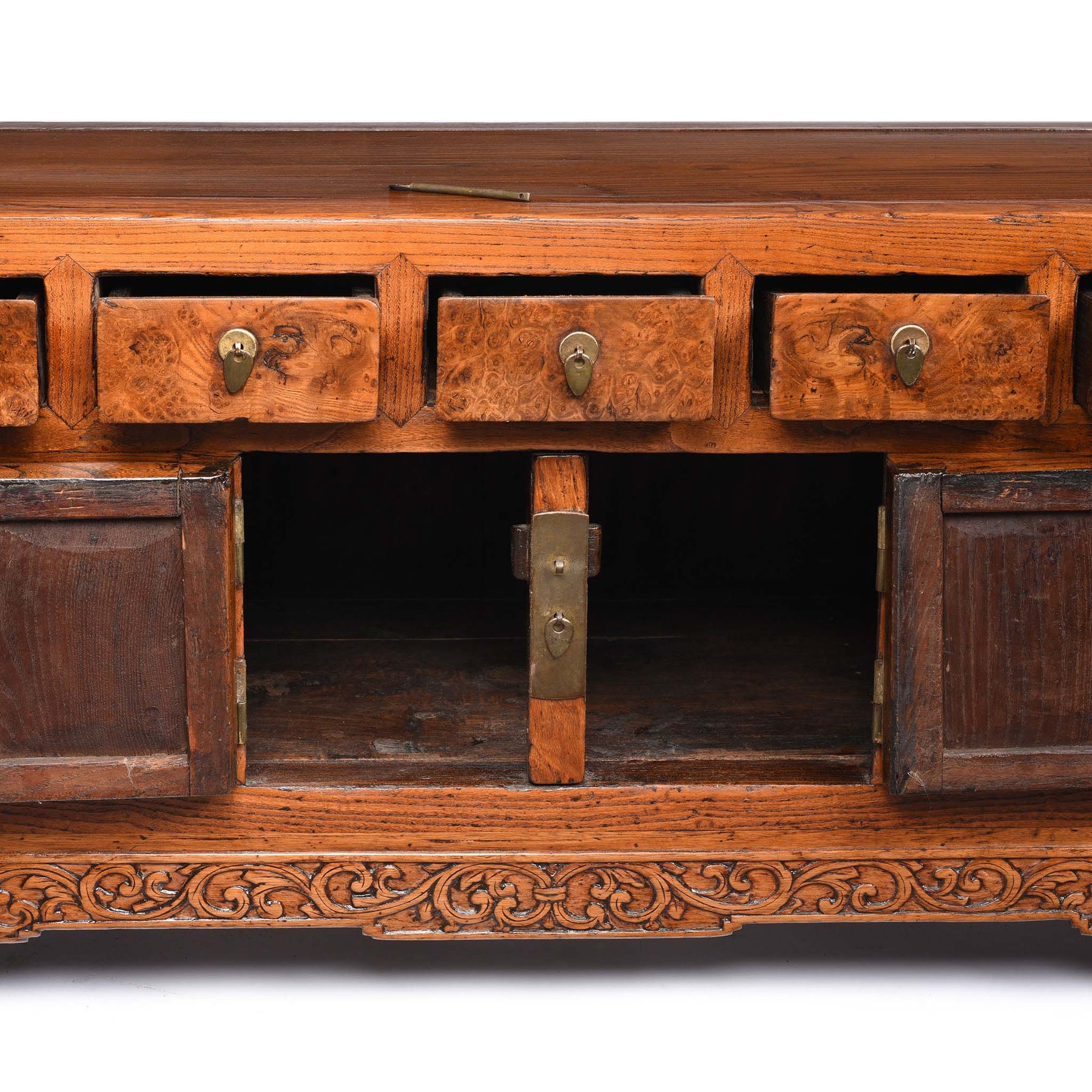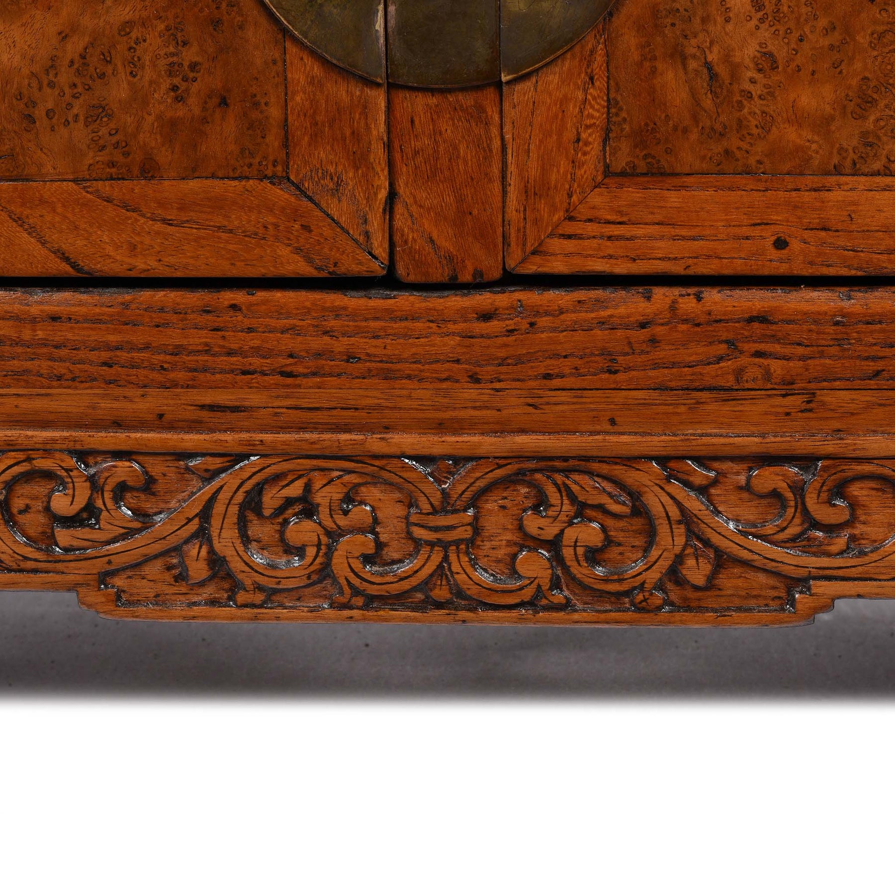 This antique Chinese kang cabinet is a special piece and is made in the traditional Ming style. It dates to the 19th century (Qing dynasty, 1644 - 1911). Constructed with burr elm wood panels and a northern elm (yumu) frame - these cabinets from Tianjin are considerably rarer to find with burr wood.