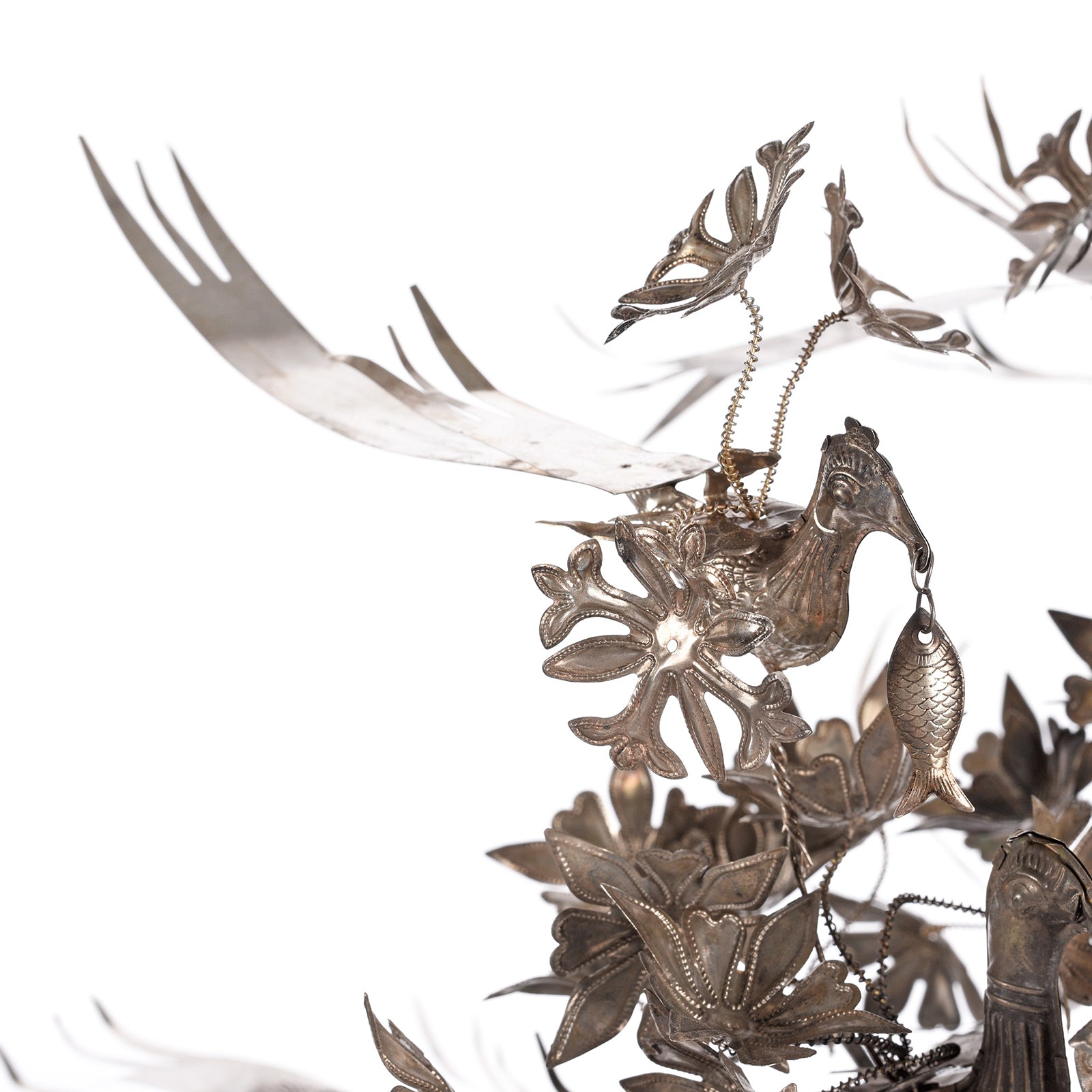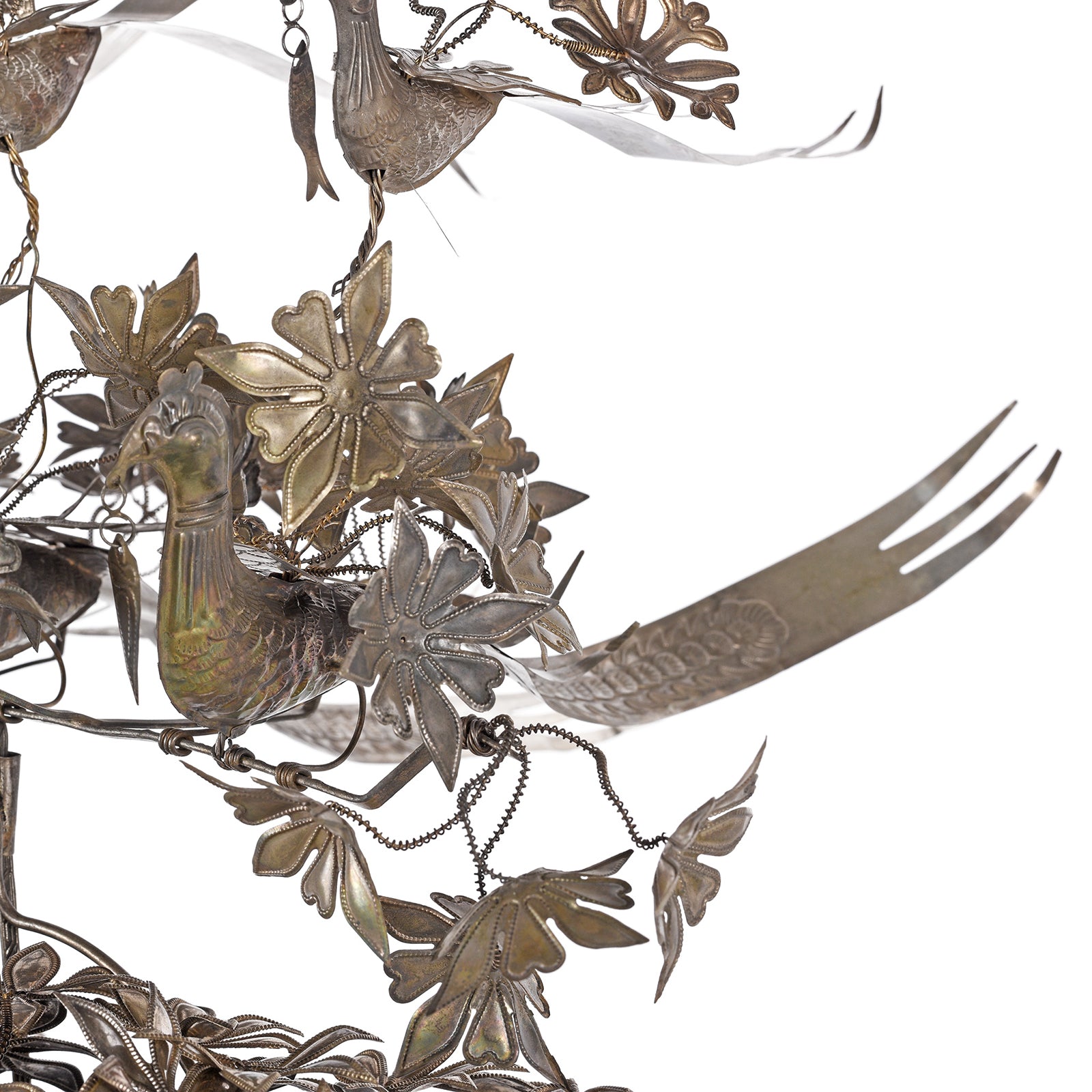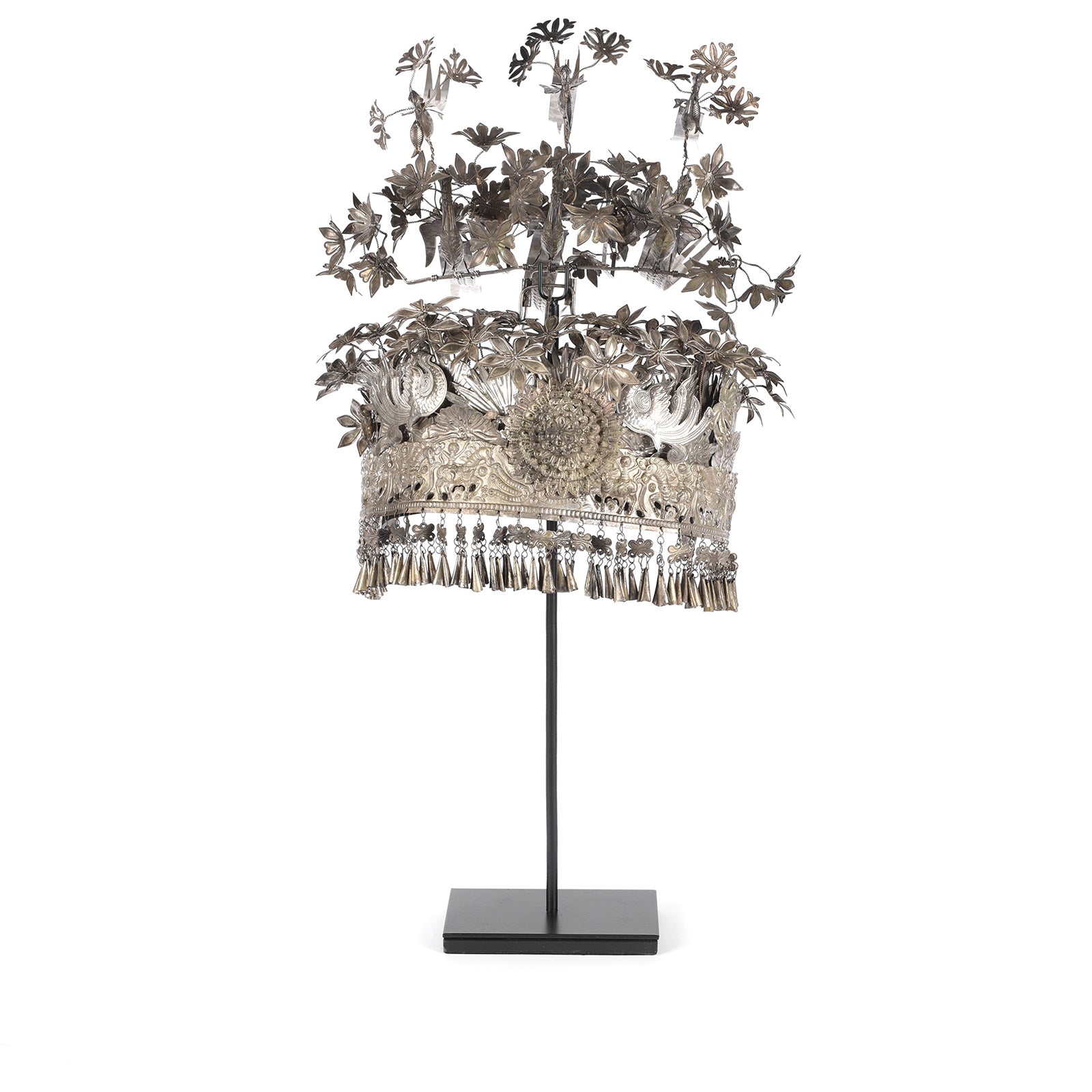 A highly decorative reproduction ceremonial Headdress used for weddings and festivals by the Miao tribe of Guizhou Province. It is made from silver-plated repousse work and decorated with birds, flowers and men riding horses. From Guizhou Province is in the South of China - not far from the Vietnam and Laos borders.