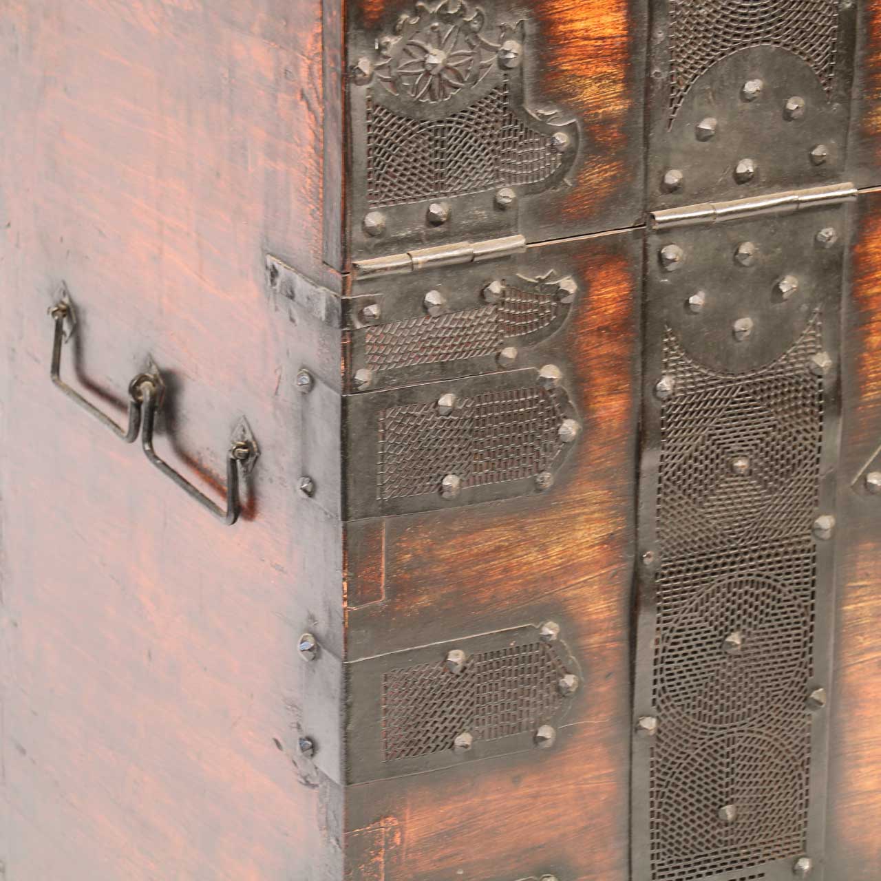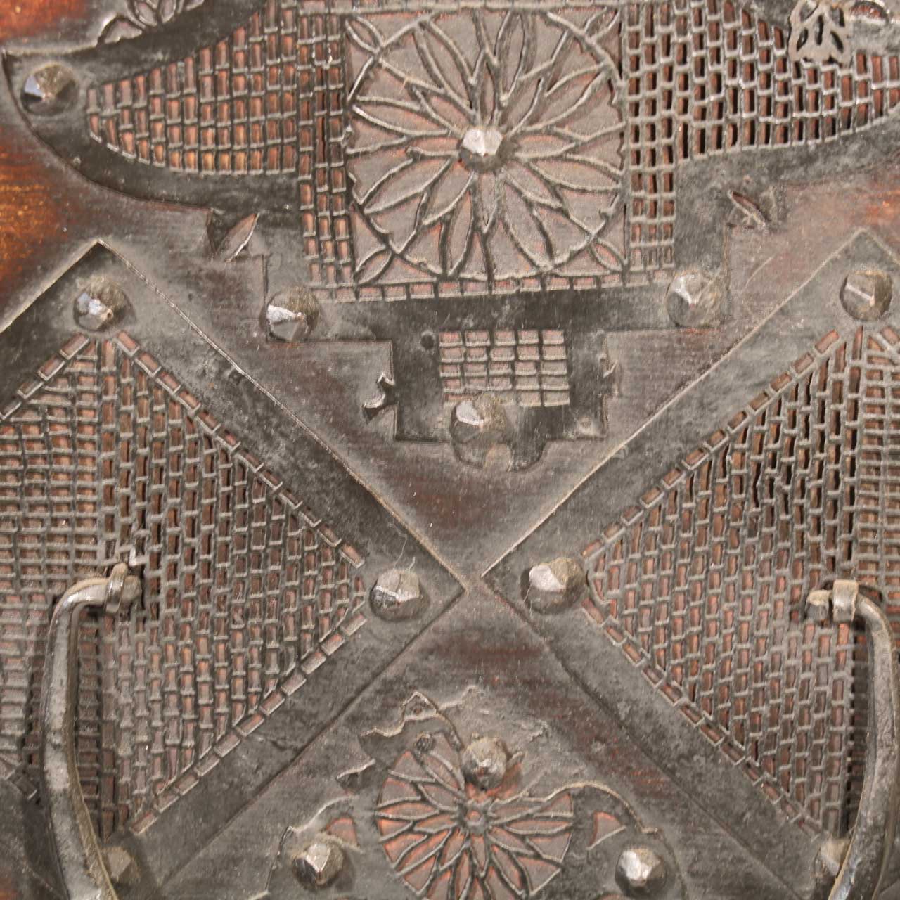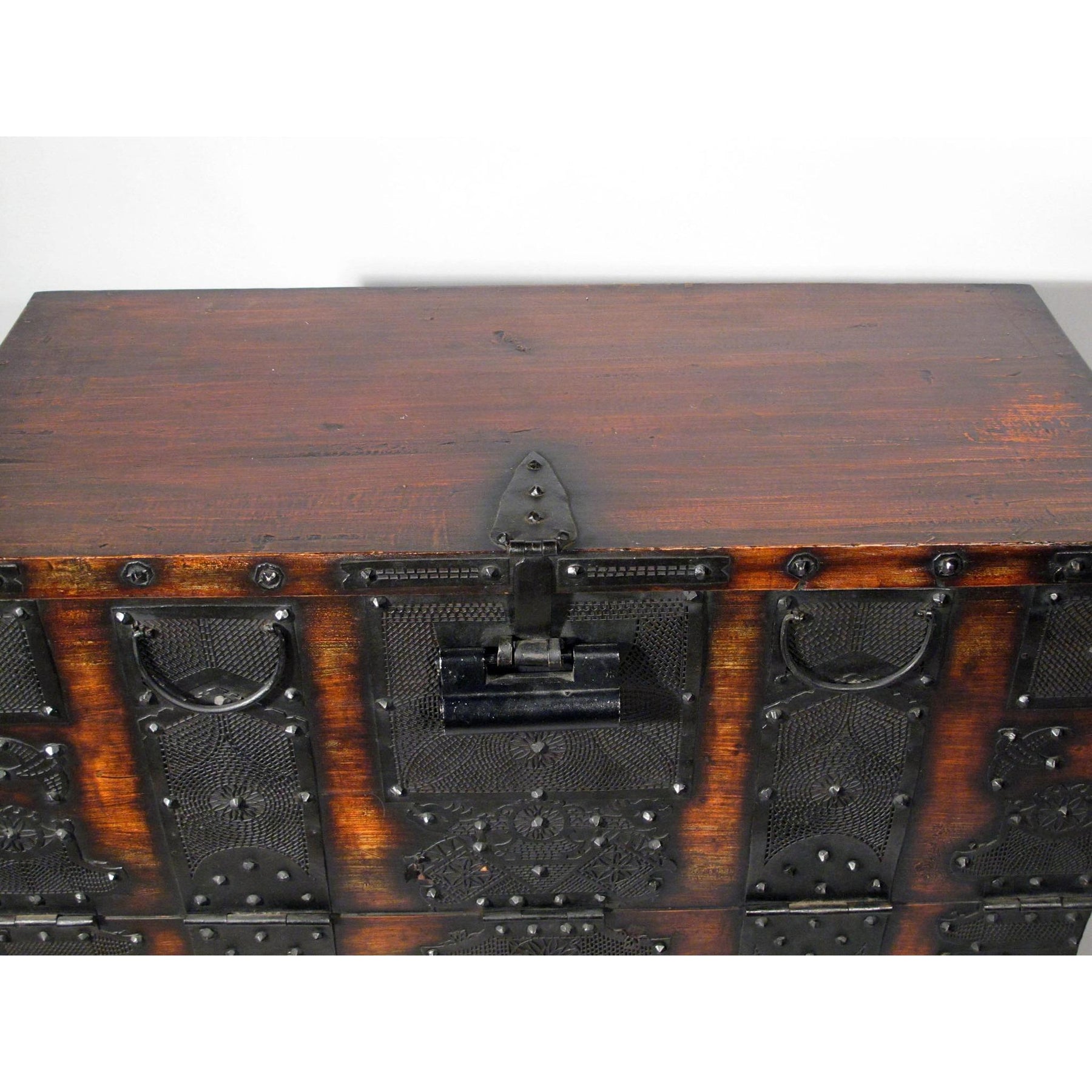 Korean Dowry Chest - Early 20thC with strapped corners and decorated with pierced iron panels. The front falls open to reveal a calligraphic papered interior.