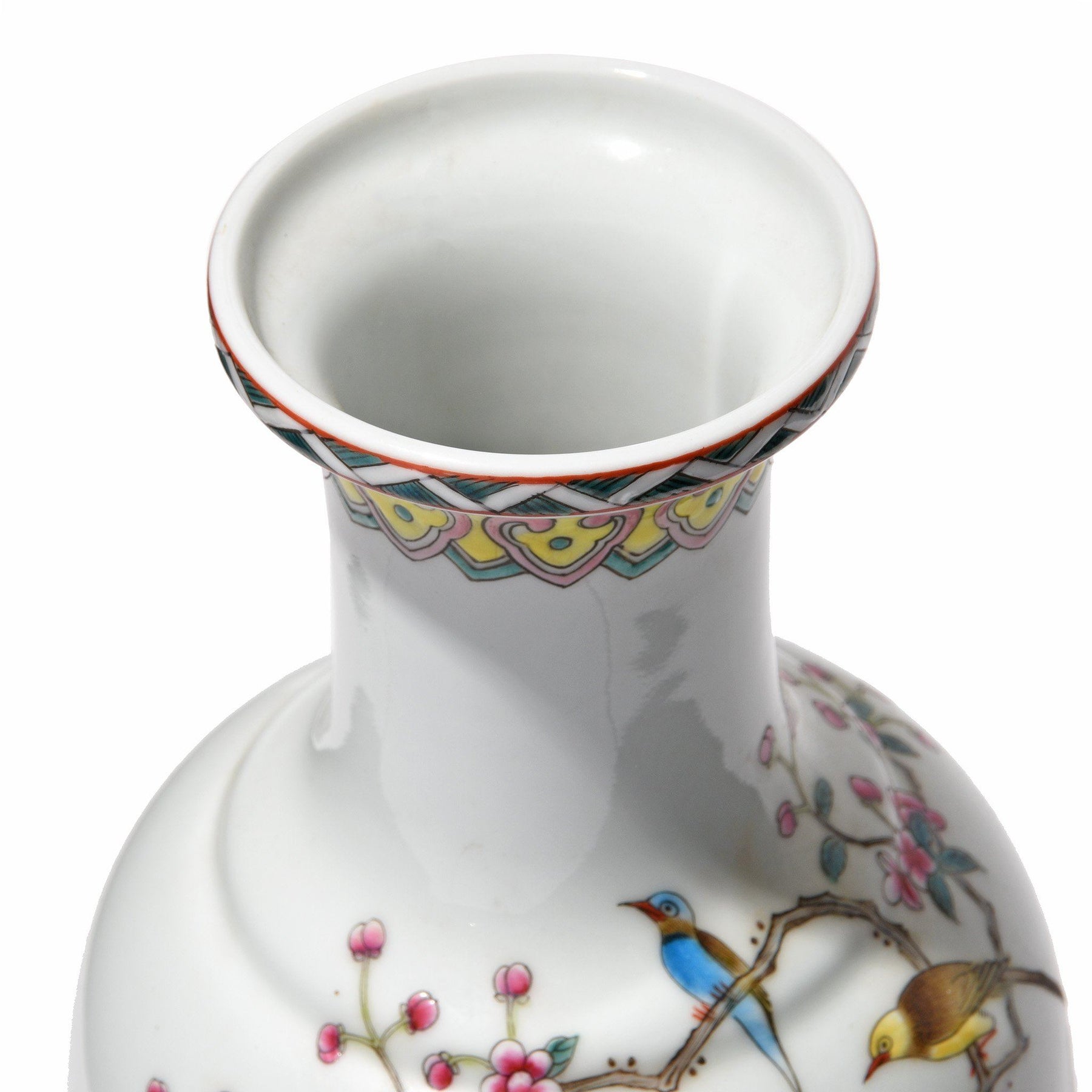 This reproduction Chinese famille rose porcelain vase is hand painted and made in the classic Chinese style.