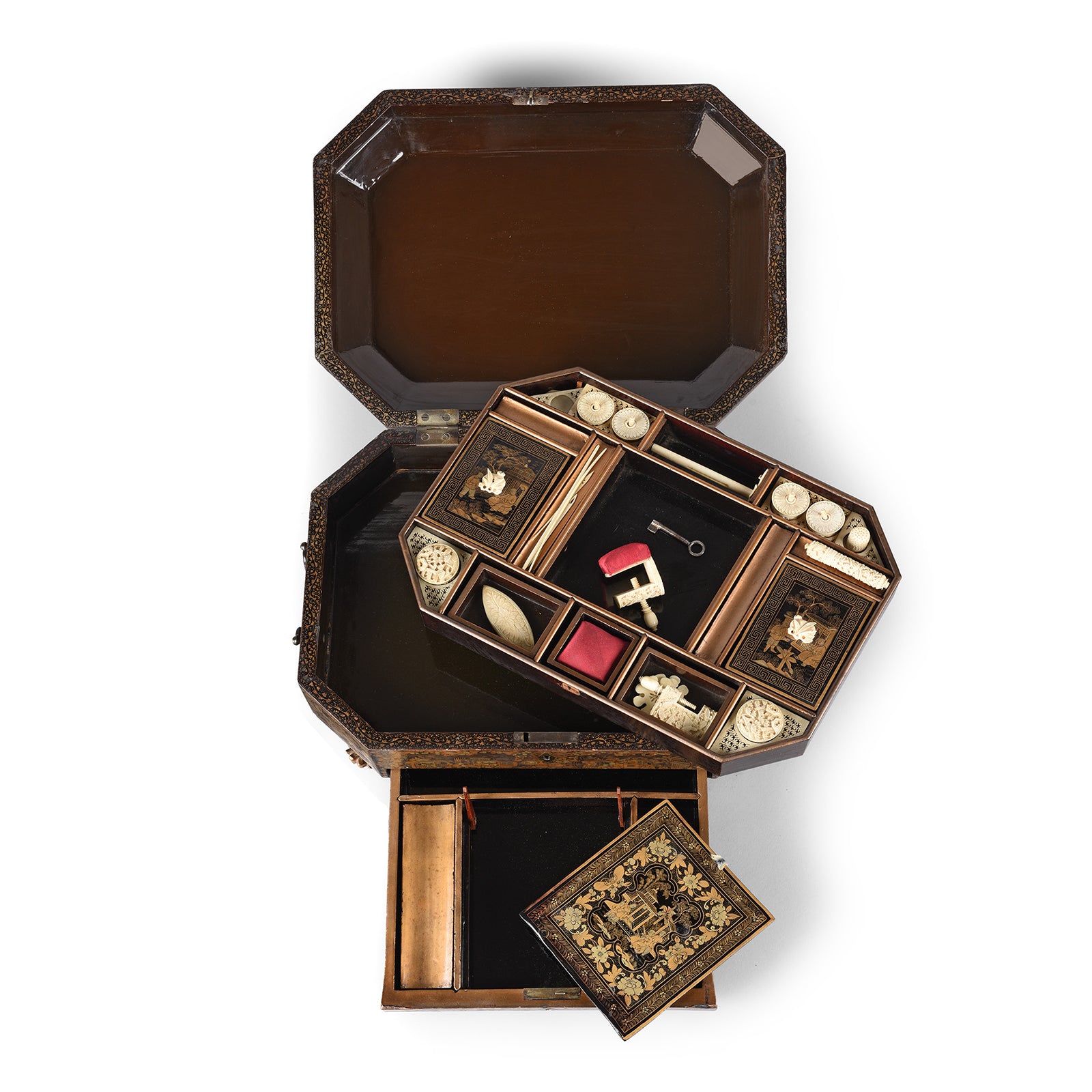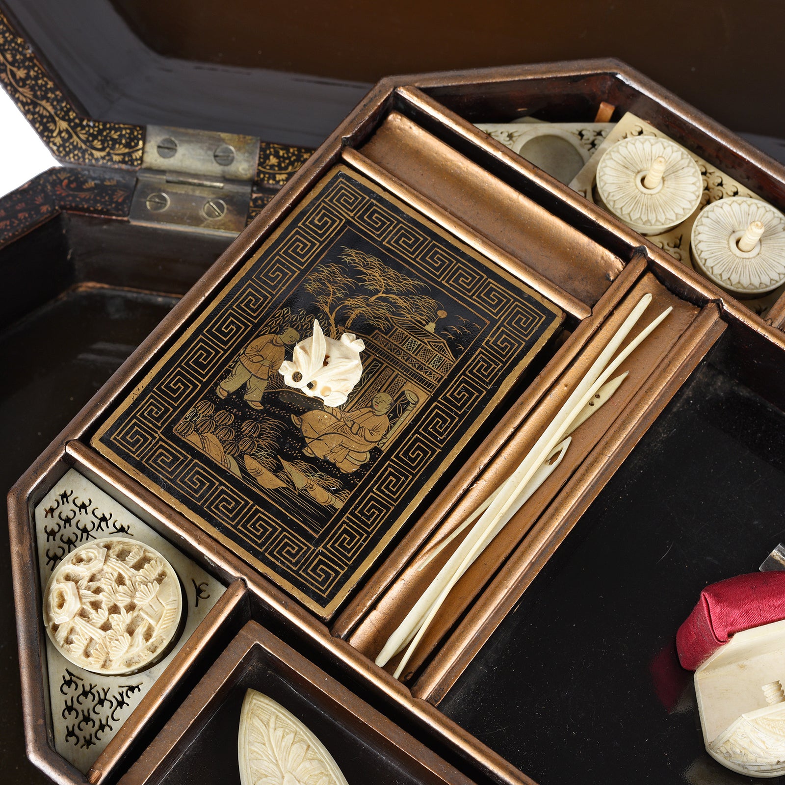 Contents Detail From Antique Chinoiserie Export Black Lacquer Sewing Box | Indigo Antiques