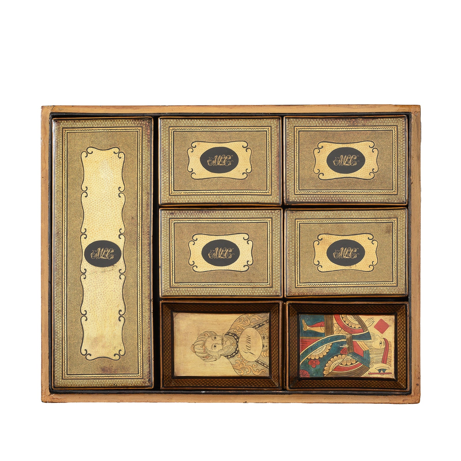 This superb games box is initialled MLC with Chinese pastoral scenes depicted on the lid around the central cartouche. The interior compartments are similarly initialled. Lifting the lid reveals various boxes containing wooden counters and an elongated box for storing cards. The extravagant coloured lacquer trays are for playing the 'Pope Joan' card game. Pope Joan was a popular 19th century British game first recorded in 1732.