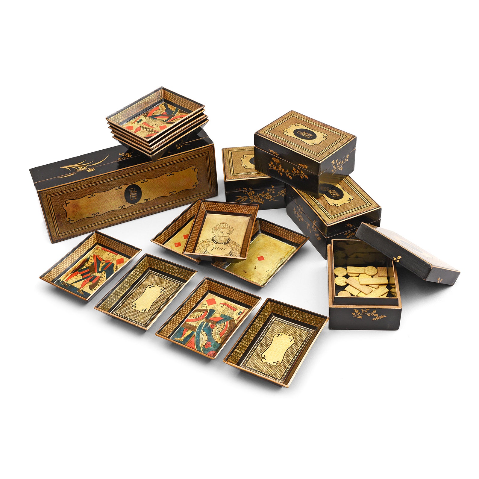 Contents Of Antique Canton Export Black Lacquer Games Box| Indigo Antiques