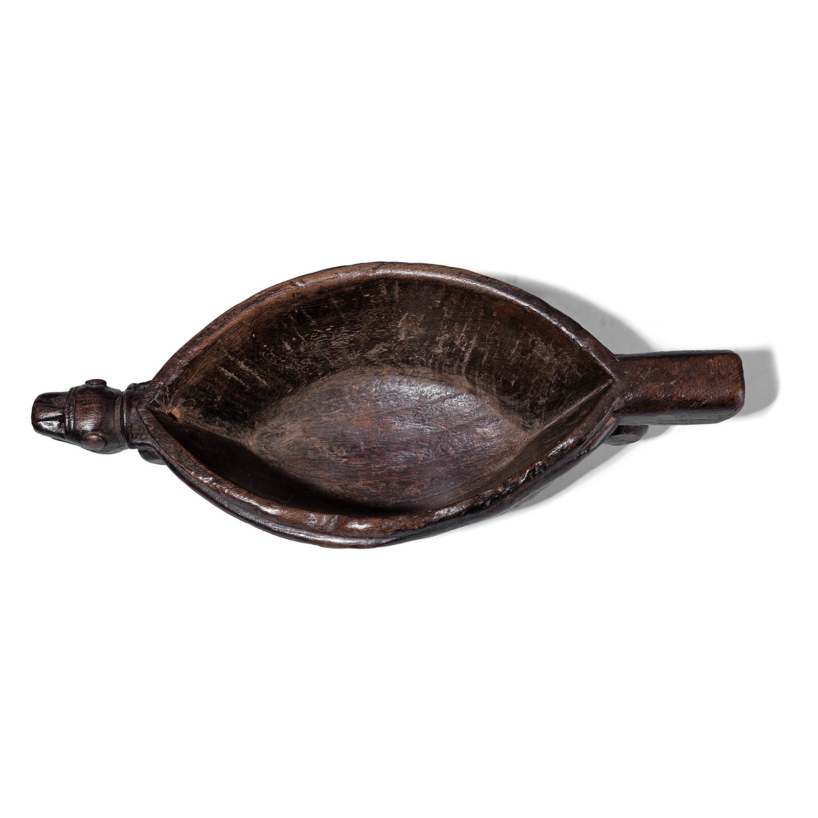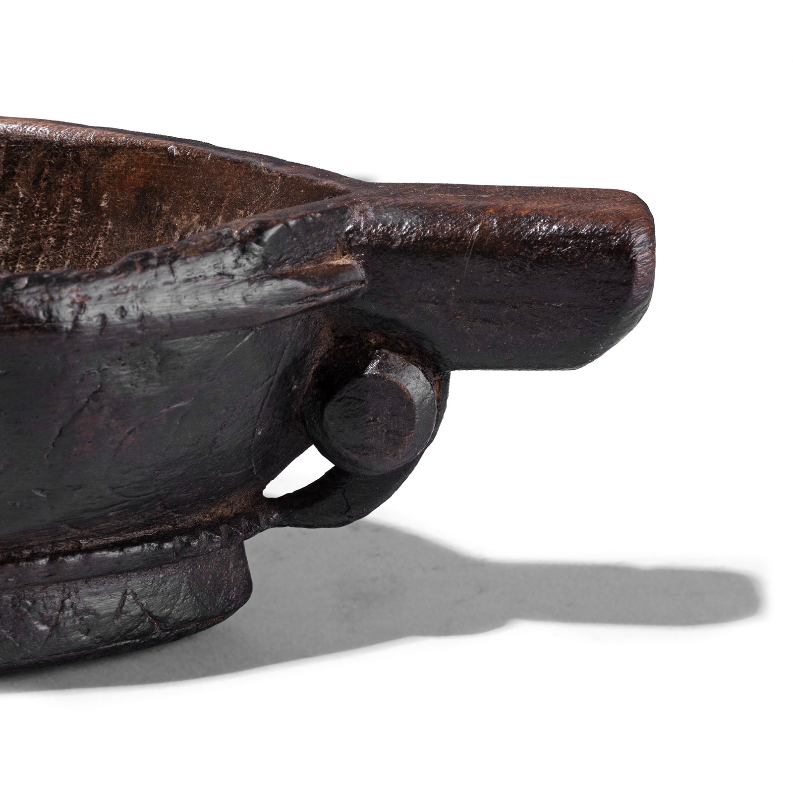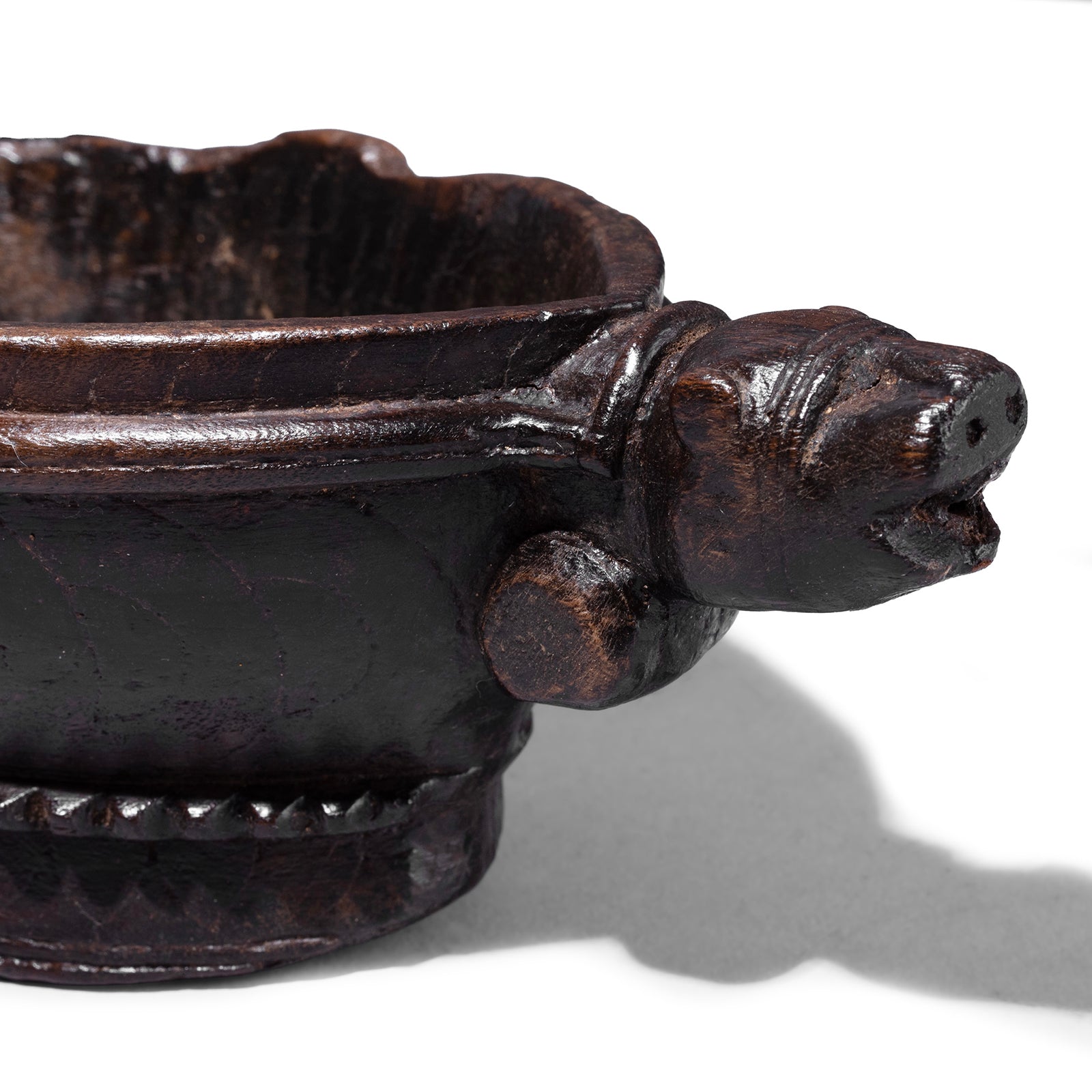 This beautifully carved 19th-century teak kharal from Rajasthan was traditionally used for grinding opium, an important part of rural ritual life for centuries. Hand-carved from a single solid piece of teak, it has developed a deep, dark patina from long use and careful handling over generations. The sculptor has shaped the vessel with elegant, leaf-like contours, and the spout end is carved with the stylised head of a tiger, its open mouth and rounded features giving the piece a lively presence. Tiger motifs symbolise power, guardianship and protection in Rajasthani folk tradition.