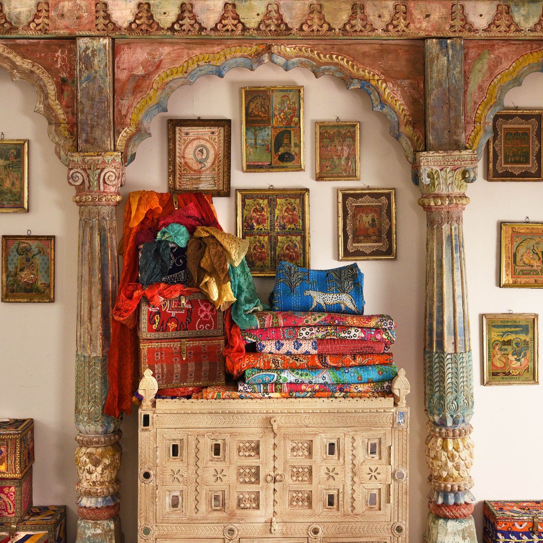 Carved Teak Triple Arch From Maharashtra - Late 19thC With Textile | Indigo Antiques