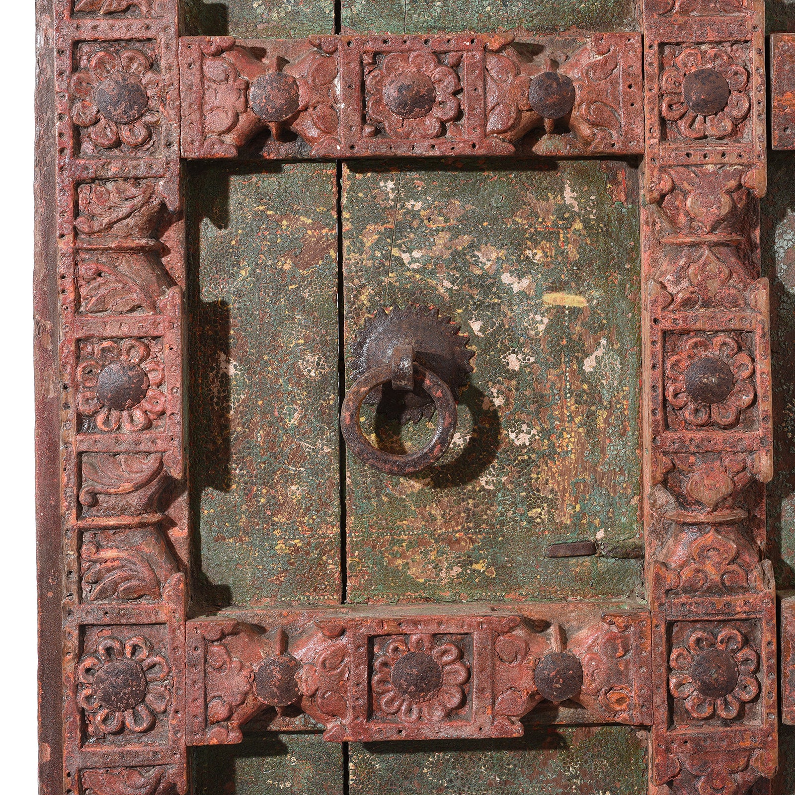 This lovely painted Indian door has been salvaged from an old building in Gujarat. The carving style is indicative of Kutchi doors but the painting style is more reminiscent of Rajasthan. Delicately painted flowers can be found on a lush green painted background. The frames are painted a rich cinnabar red with carved peacocks and lotus flowers.