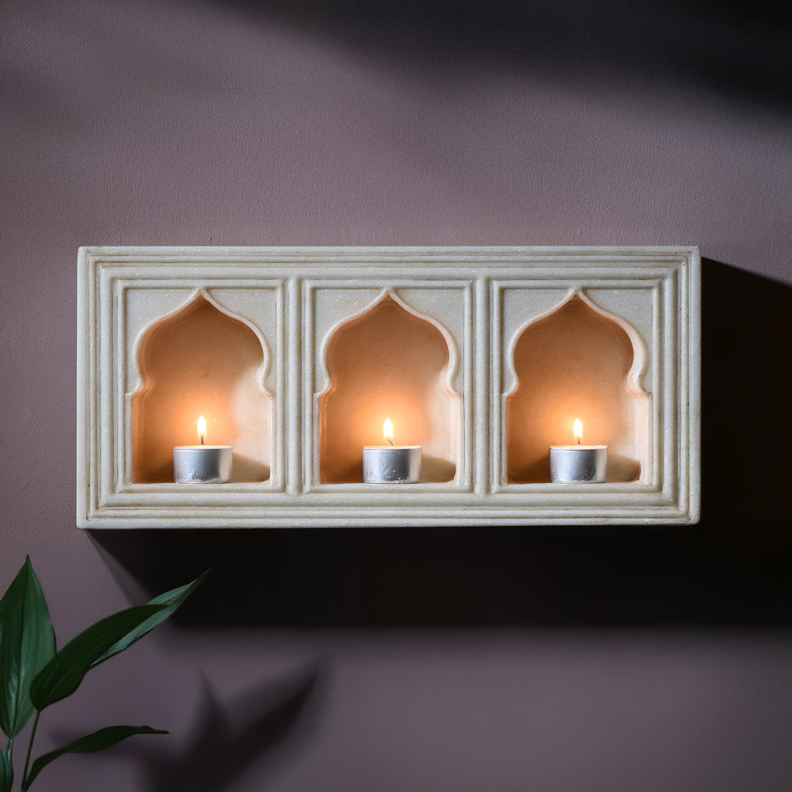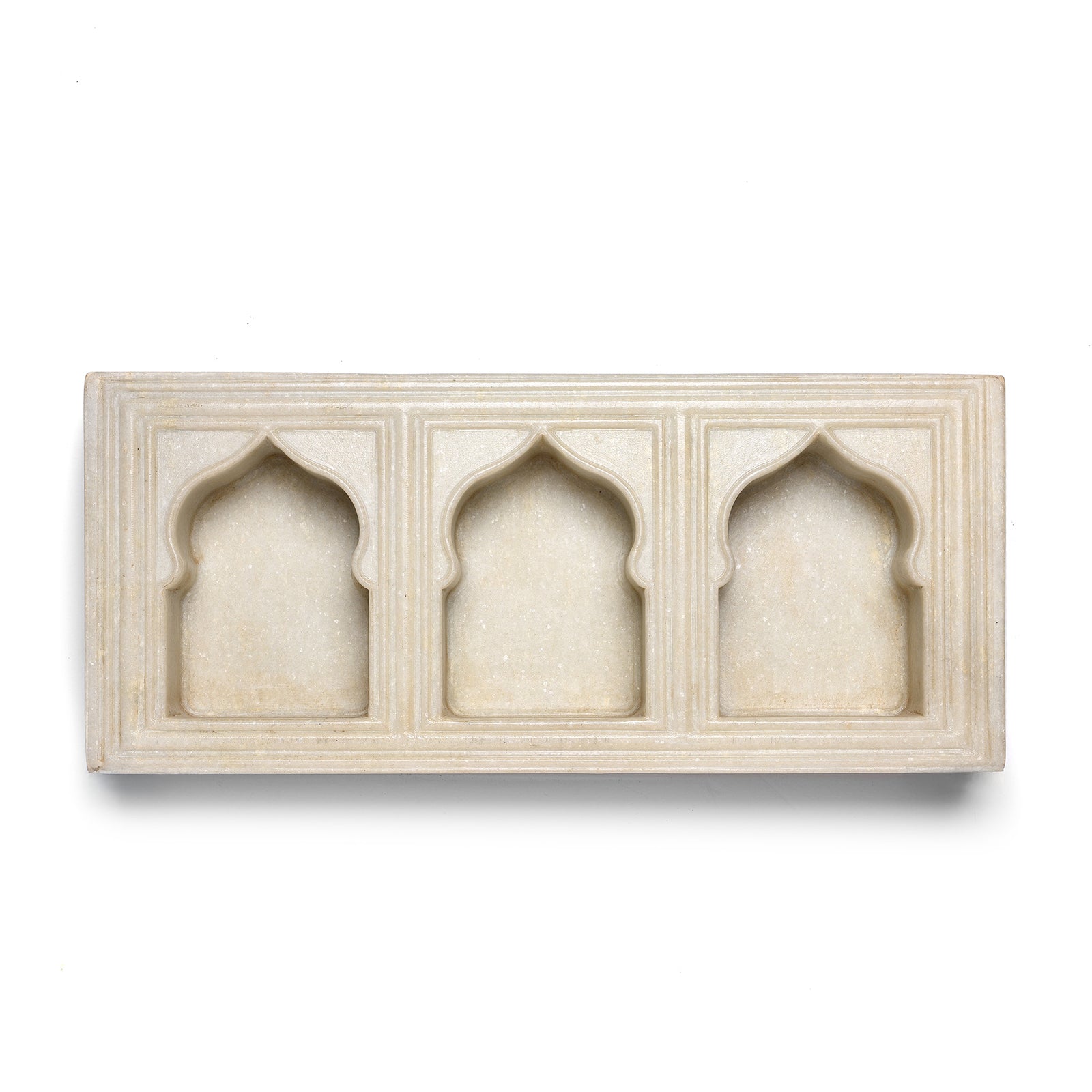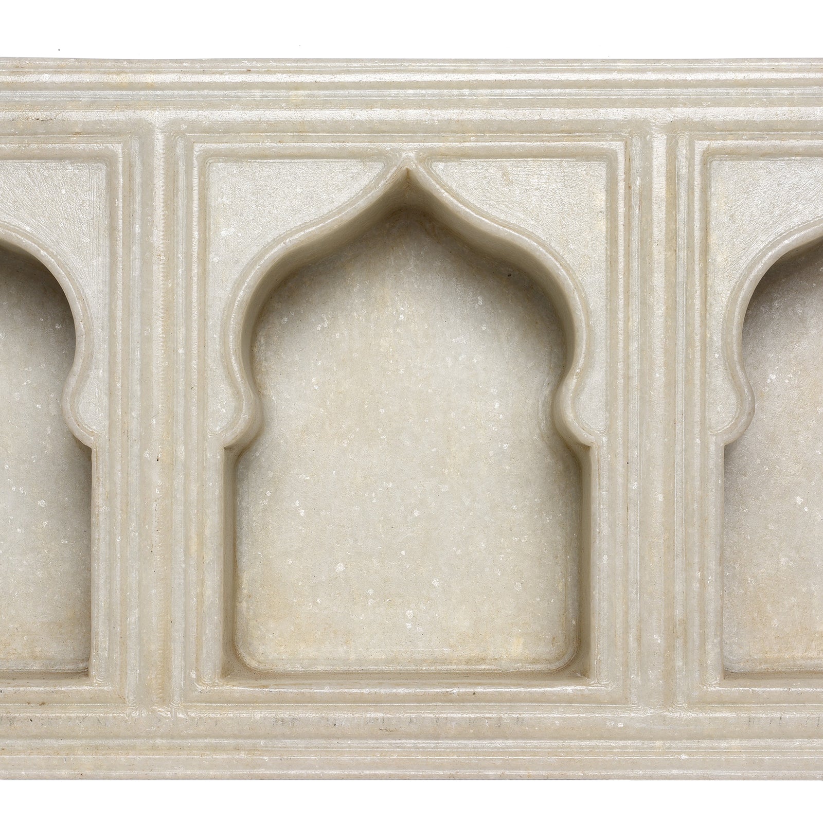 Hand Carved in Rajasthan this lovely white marble 3 way lamp niche is carved in the Mughal style.