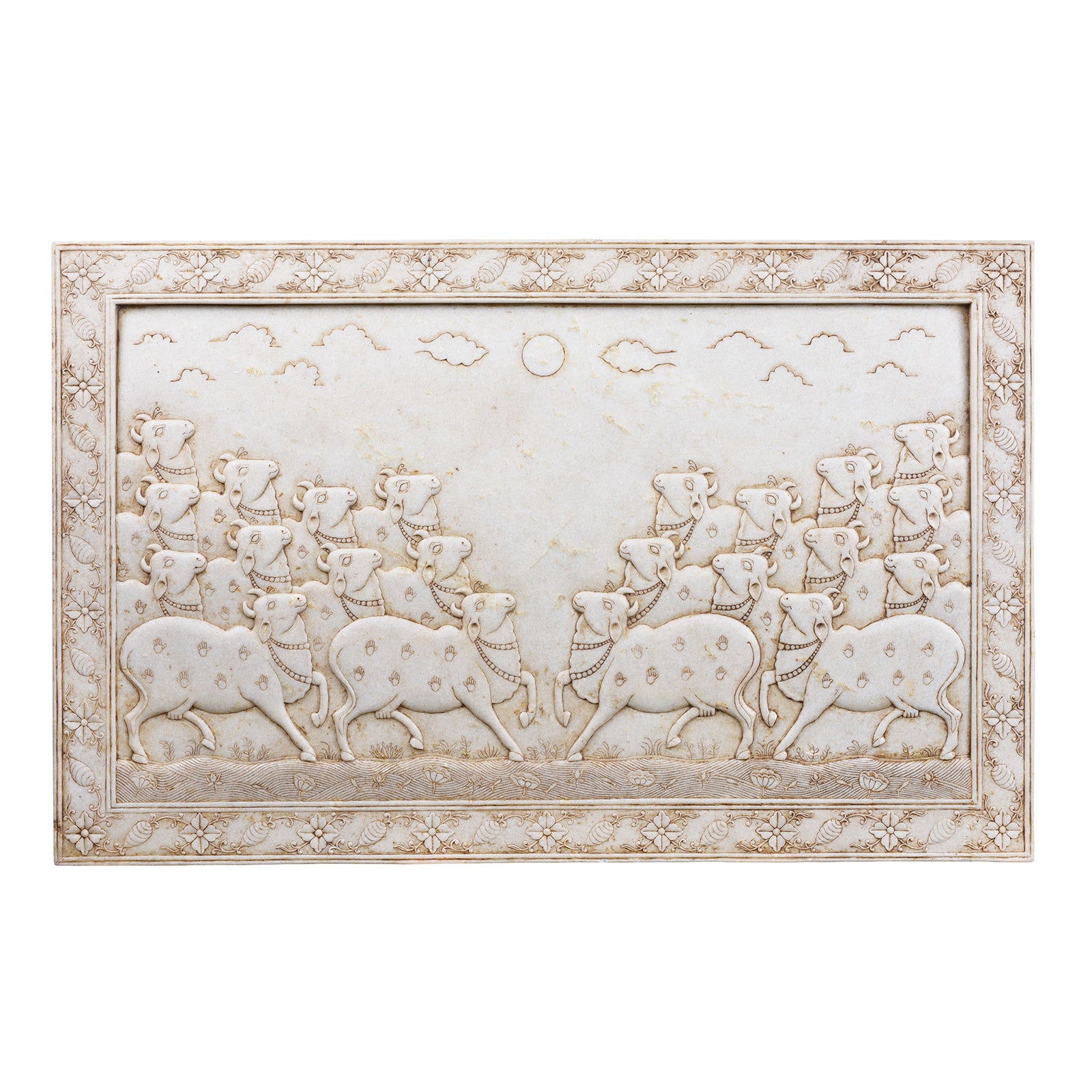This finely hand carved white marble panel illustrates the Gopashtami festival, commemorating the gathering of cattle when Krishna was appointed as a cowherd. Celebrated in late autumn, this event honours Krishna's pastoral life and remains a vibrant tradition in India today.