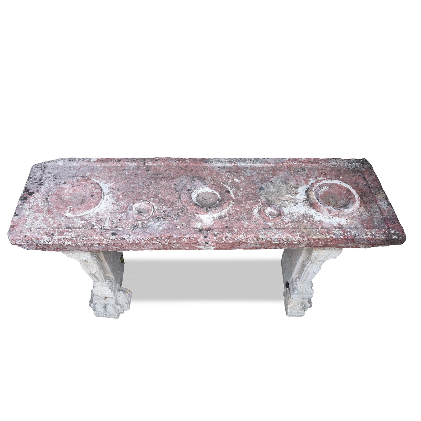 This antique parinda from Gujarat, western India, is a window into traditional Indian village architecture. Hand-carved from stone, its rose-pink surface and ornate legs display beautifully intricate carving - note the lotus-style column bases and deep geometric carving along the top edge. Designed to support earthen water pots, the parinda cleverly channels condensation from the pots into a carved drip tray, allowing water to exit through a front spout - an elegant fusion of form and function.