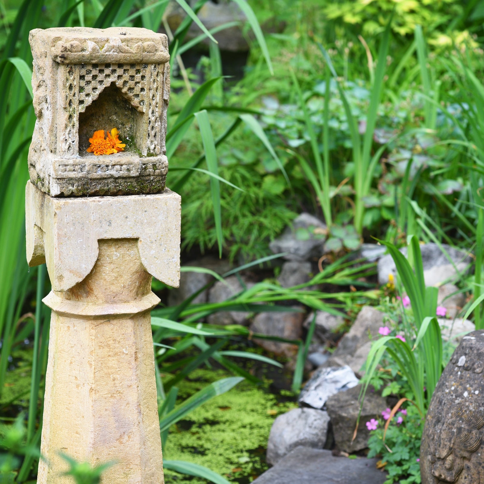 Carved decorative stone pillar from Rajasthan - This would look wonderful schemed into a garden design.
