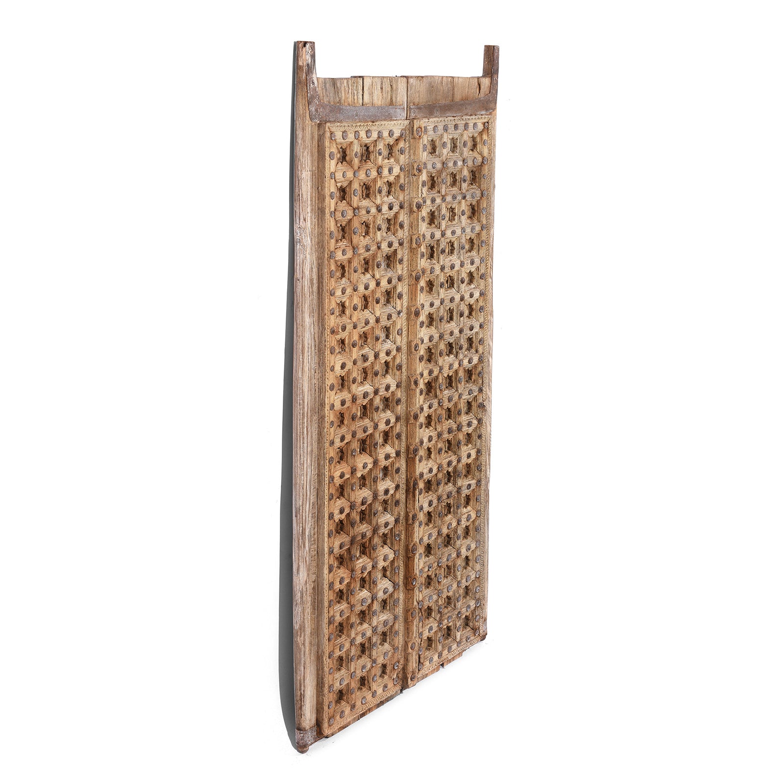 Angled View Of Antique Carved Sun Bleached Window Shutters From Punjab - 18th Century | Indigo Antiques
