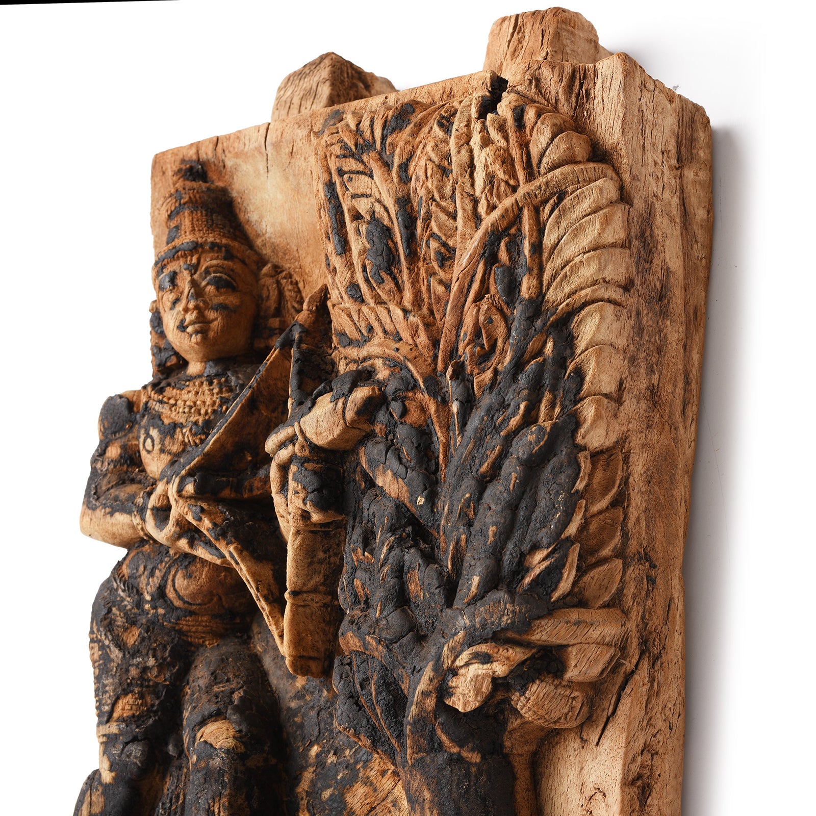 This carved teak chariot panel depicting Lord Rama is from an old temple chariot from Tamil Nadu in South India. Lord Rama is associated with virtue and was believed to be an incarnation of Vishnu. Rama is seen here wearing a Kiritamukuta, 'The Highest of All Crowns' holding a bow. This is likely a scene from The Ramayana, an ancient Hindu epic written in Sanskrit, specifically the tale of Vali & Sugriva.