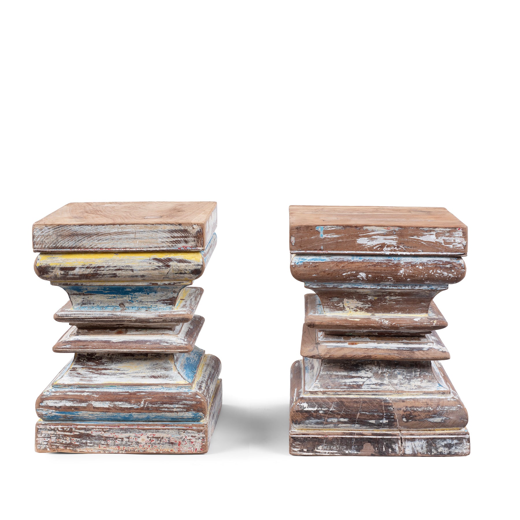 Layers of worn paint in soft blues, yellows, whites, and natural wood tones create a richly textured surface with a strong sense of history and character. The robust carved form gives the table excellent stability, while the compact scale makes it particularly versatile. Extremely durable and naturally resistant to moisture, reclaimed teak makes this an excellent choice for use in a bathroom, hallway, or living room.