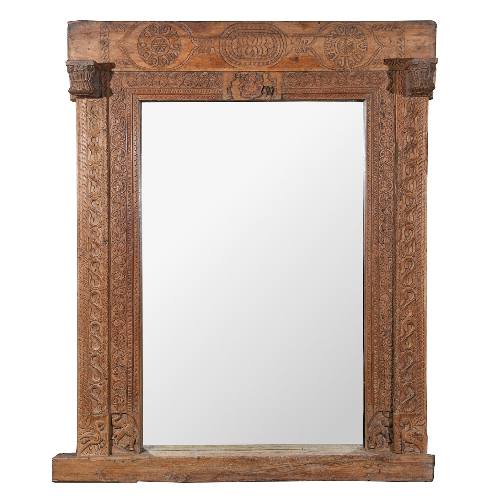 This ornately carved antique Indian teak mirror is made from an original Indian door frame from Andhra Pradesh. A carved Ganesh (Hindu elphant god) sits respendent in the centre of the lintel. Ganesh is the remover of obstacles and blesses every home to make the day to day lives of occupants easier. The mirror frame is decorated with iconic lotus flowers and flowing vines with elephant and peacock carvings at the base. Two large corbels at the top add yet more grandeur to this already impressive mirror.