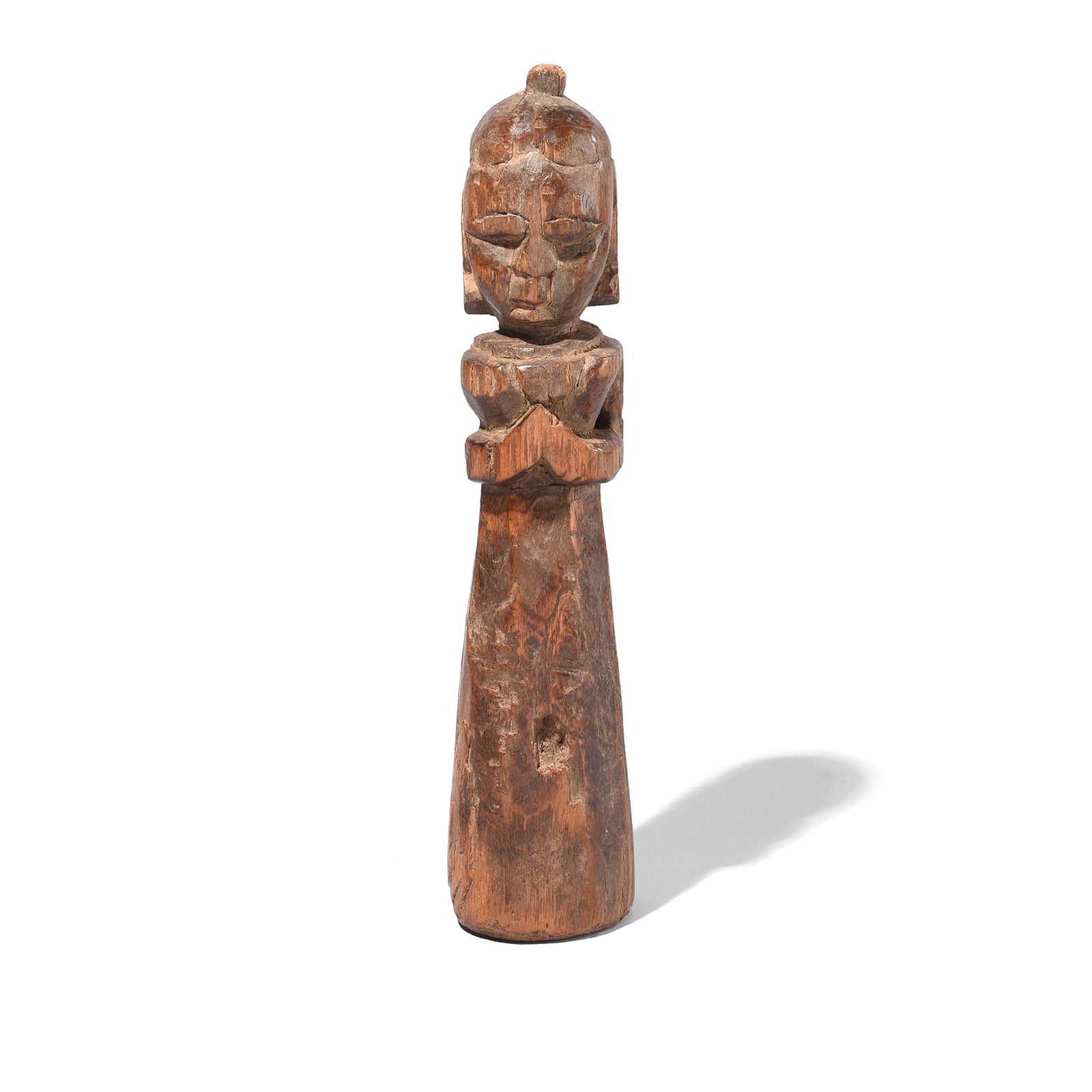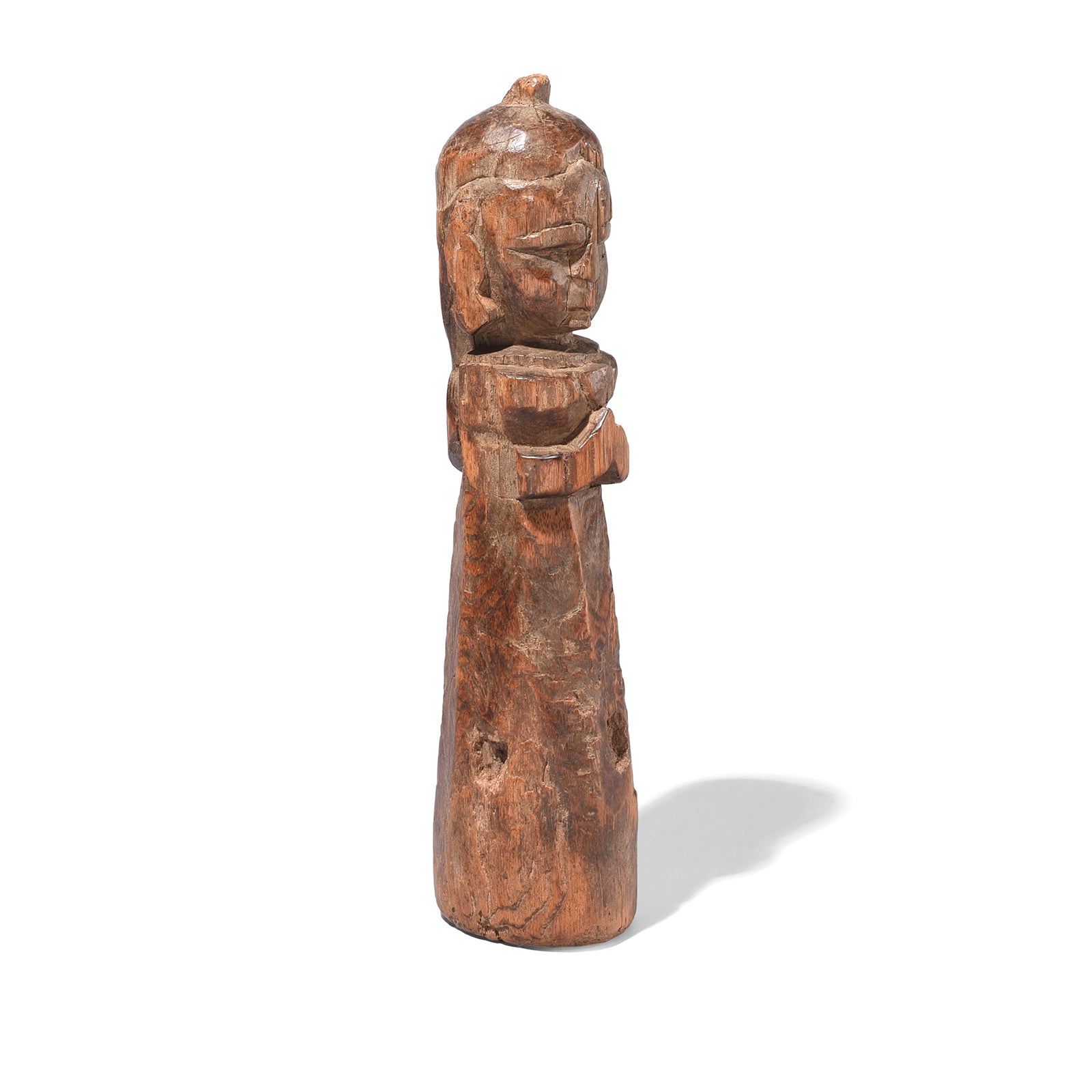 This carved teak wood doll from the Banswara district in Rajasthan has developed a wonderful patina over time. Banswara is widely populated by the Bhil ethnic group, the largest tribal group in India. The Bhil can be found across India and have a distinct style. This is a Gangaur doll given to young Bhil women during the Spring festival of Gangaur which celebrates marital happiness, during which young women pray to Gauri to find a good husband.