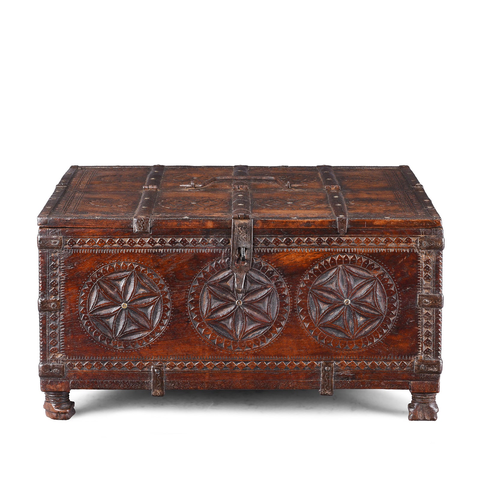 These boxes were used in the old days by merchants and traders in the bazaars for storing their cash and ledgers. They were also used by Indian families for the dowry of their daughters, as a trousseau. This style of box is often decorated with chip carving that is almost identical to European chip carving, probably because of contact in ancient times with traders and armies traveling from the north.