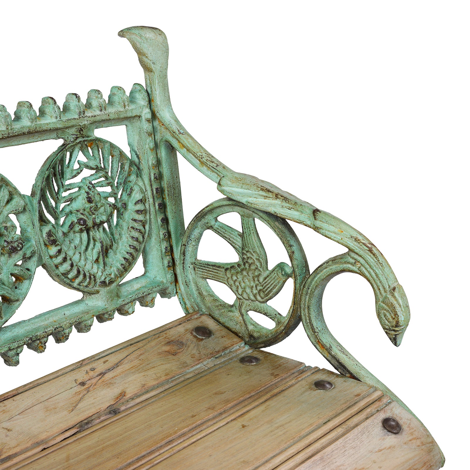 A softly weathered verdigris finish gives the piece a gentle patina, complementing the natural tones of its solid wooden slats. At once nostalgic and enduring, it makes a striking counterpoint to contemporary garden furniture€”ideal for adding character and comfort to a quiet corner or sunlit terrace.