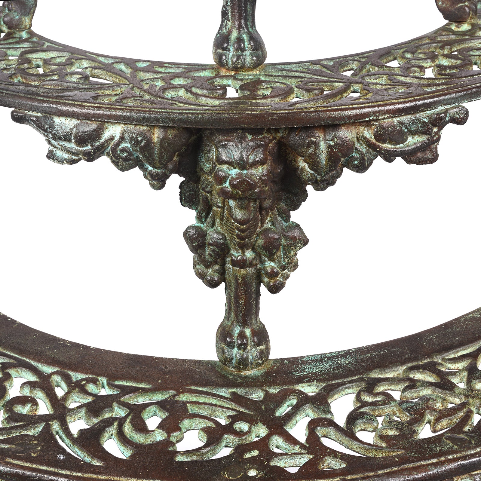 Introducing this beautiful gothic cast iron garden plant stand, a stunning piece of outdoor furniture designed to give a solid base for displaying garden pot plants. Crafted from robust cast iron, it is finished with a light verdegris rustic effect.