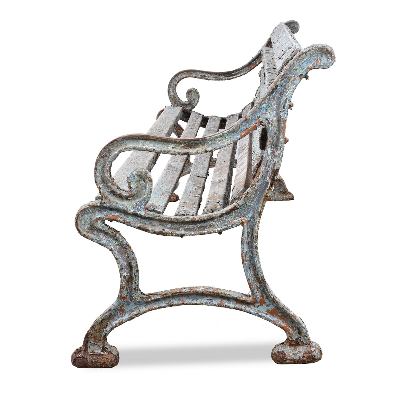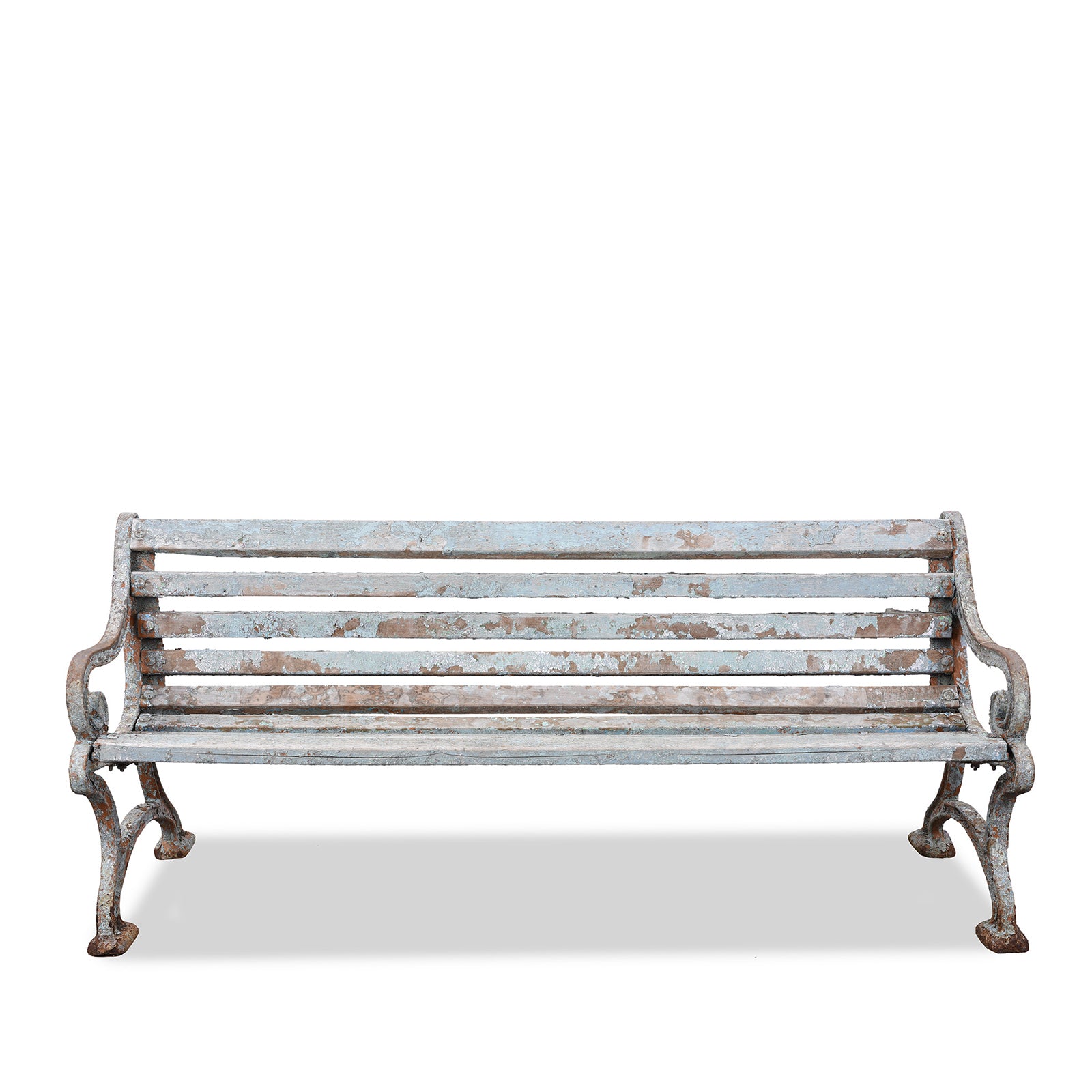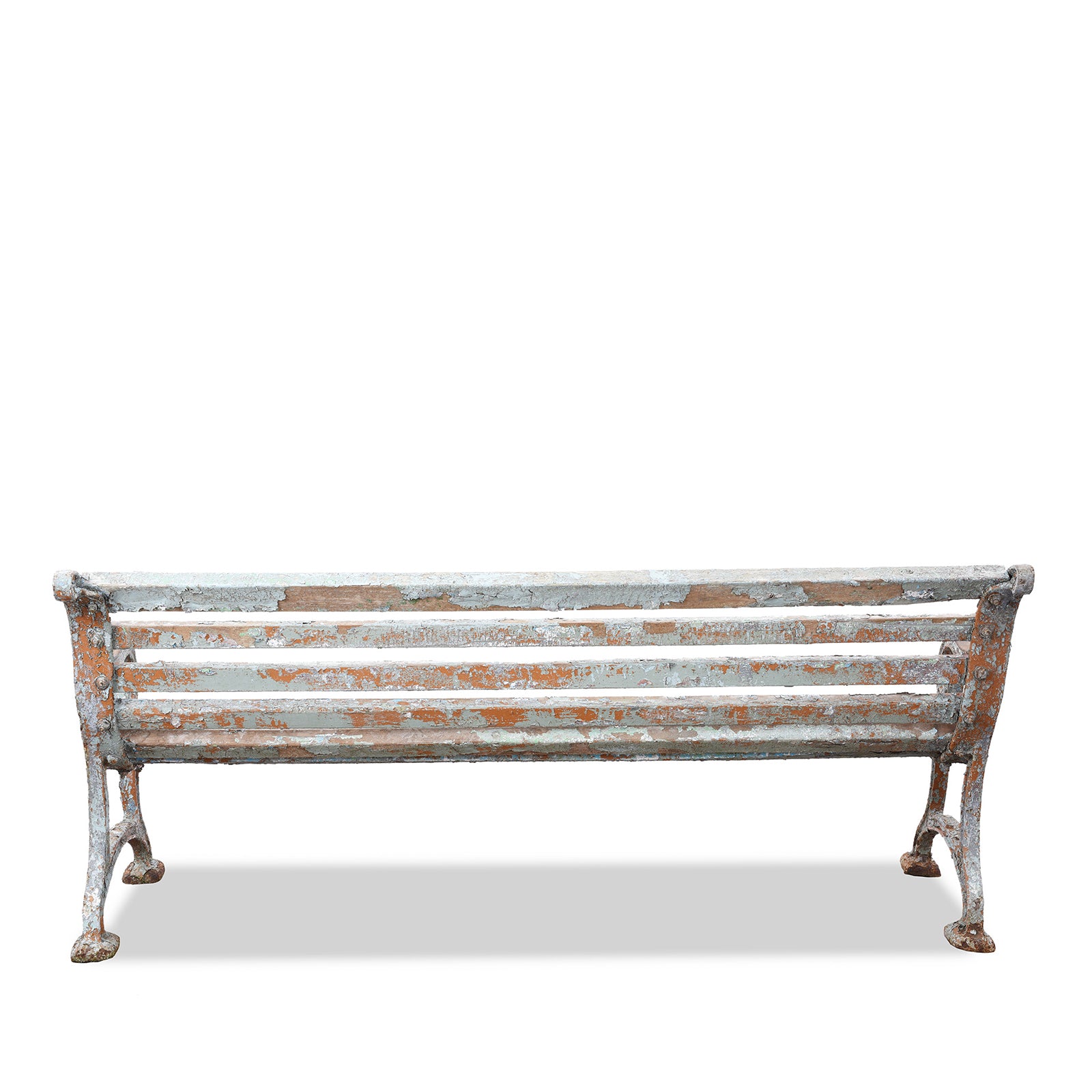 This cast iron and wooden bench is an Early 20th century Indian copy of an English style bench from the 19th Century. The dense cast iron ends would have been used as ballast on returning trade ships. It is the perfect counterpoint or companion to modern garden furniture. Already showing hallmarks of a lifetime of utility, this hefty bench promises to continue doing so for many years to come.