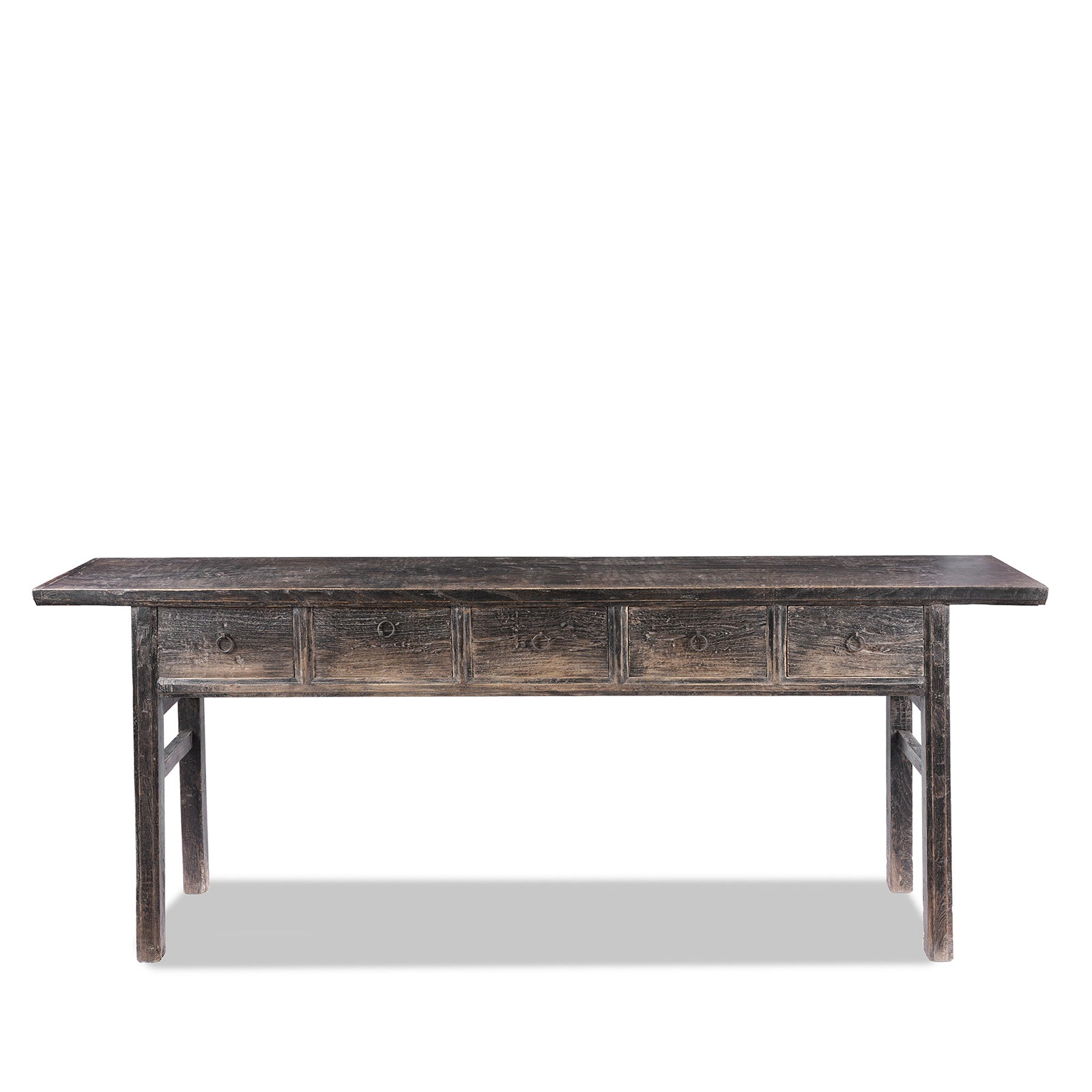 This elm (yumu) console table is from a Shanxi farmhouse and dates from the 19th century. It has five handy drawers and is still coated in its original black lacquer.