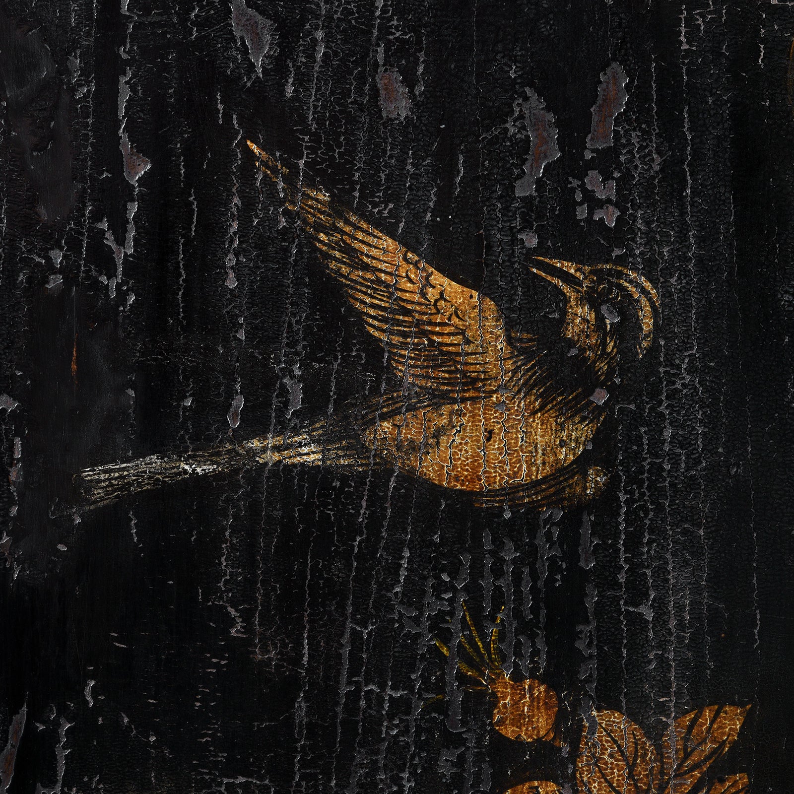 The design features swooping kingfishers and doves over blossoming chrysanthemums & hibiscus flowers. This is framed by a trailing floral design. The black lacquer surface is worn with age. Our restoration team has carefully consolidated and conserved the lacquer to avoid any further aging.
