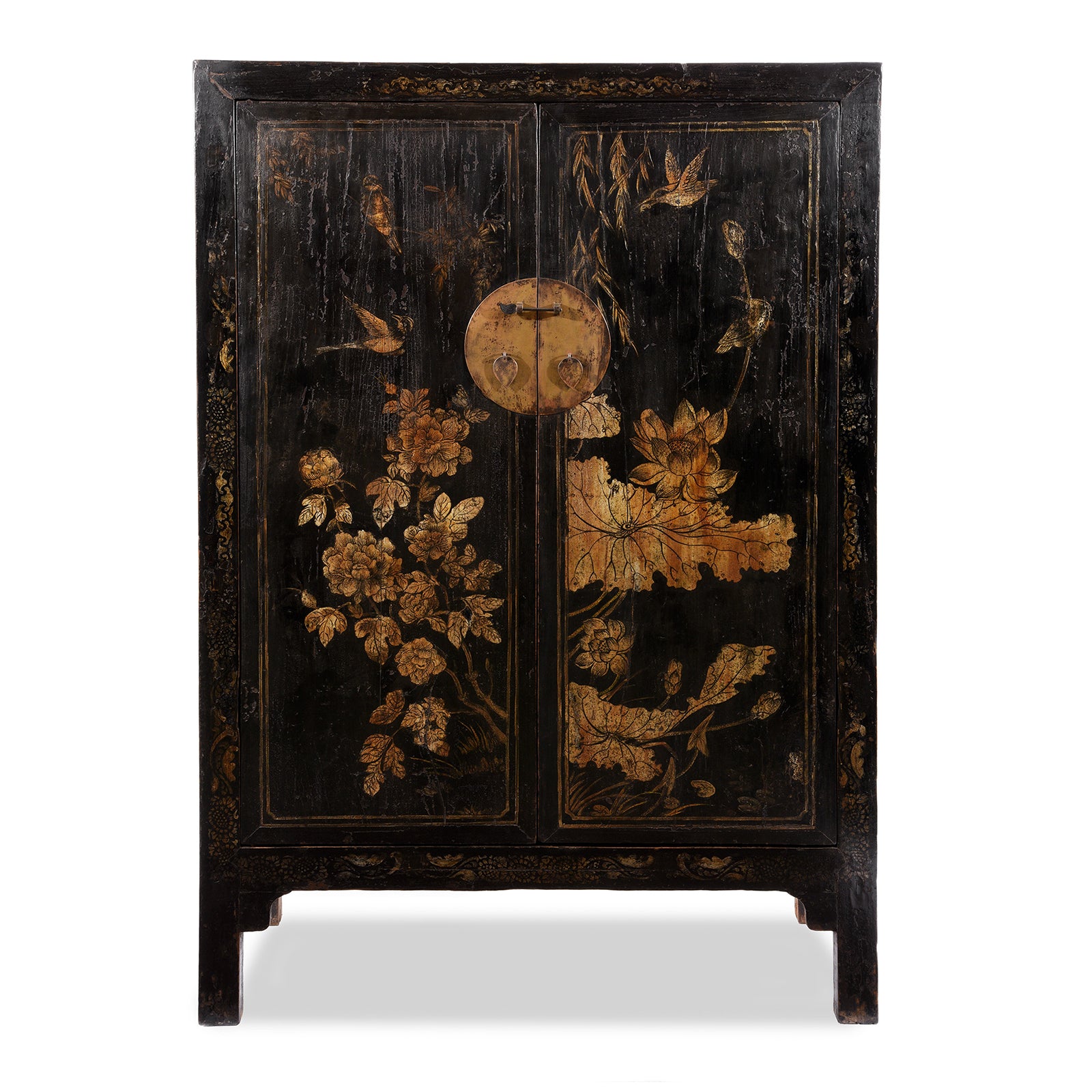 Antique Chinese Black Lacquer Wedding Cabinet From Provincial Shanxi with Chrysanthemum & Hibiscus Designs   -19th Century | Indigo Antiques