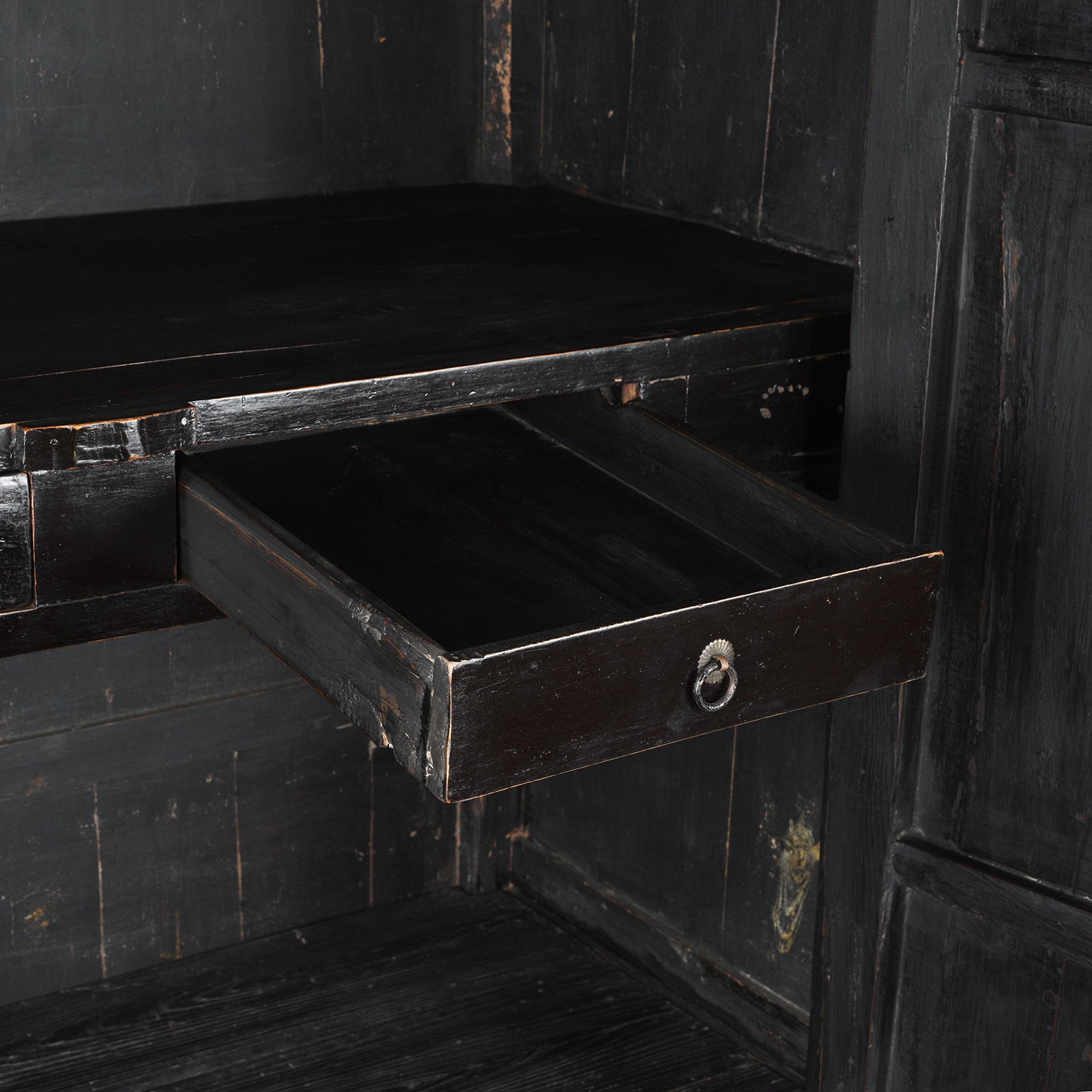 Shanxi cabinets like this one are rare to find with original drawers which make this cabinet particularly functional. The interior consists of a large interior space separated by a shelf with two drawers underneath. The bottom of the cabinet contains a lift-away hatch that conceals a further storage area at the bottom of the cabinet.