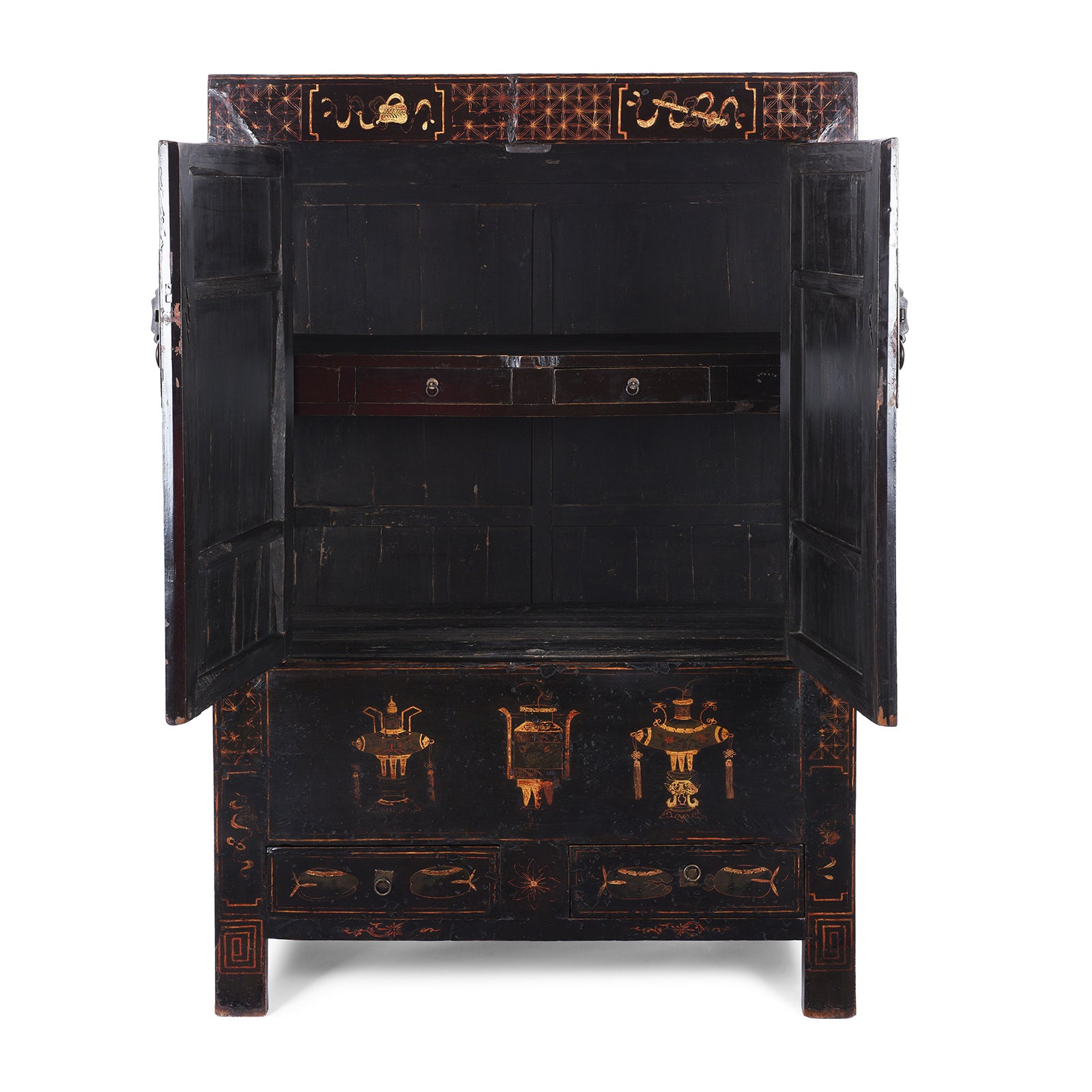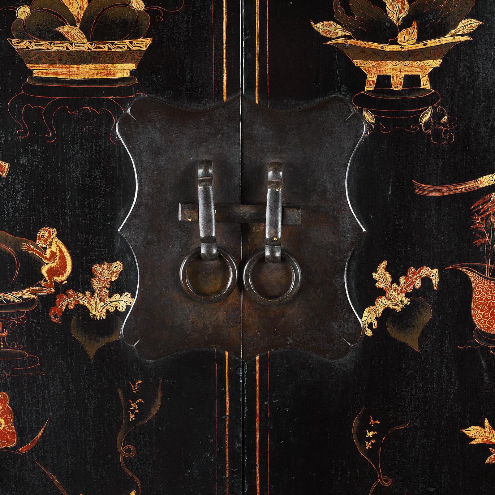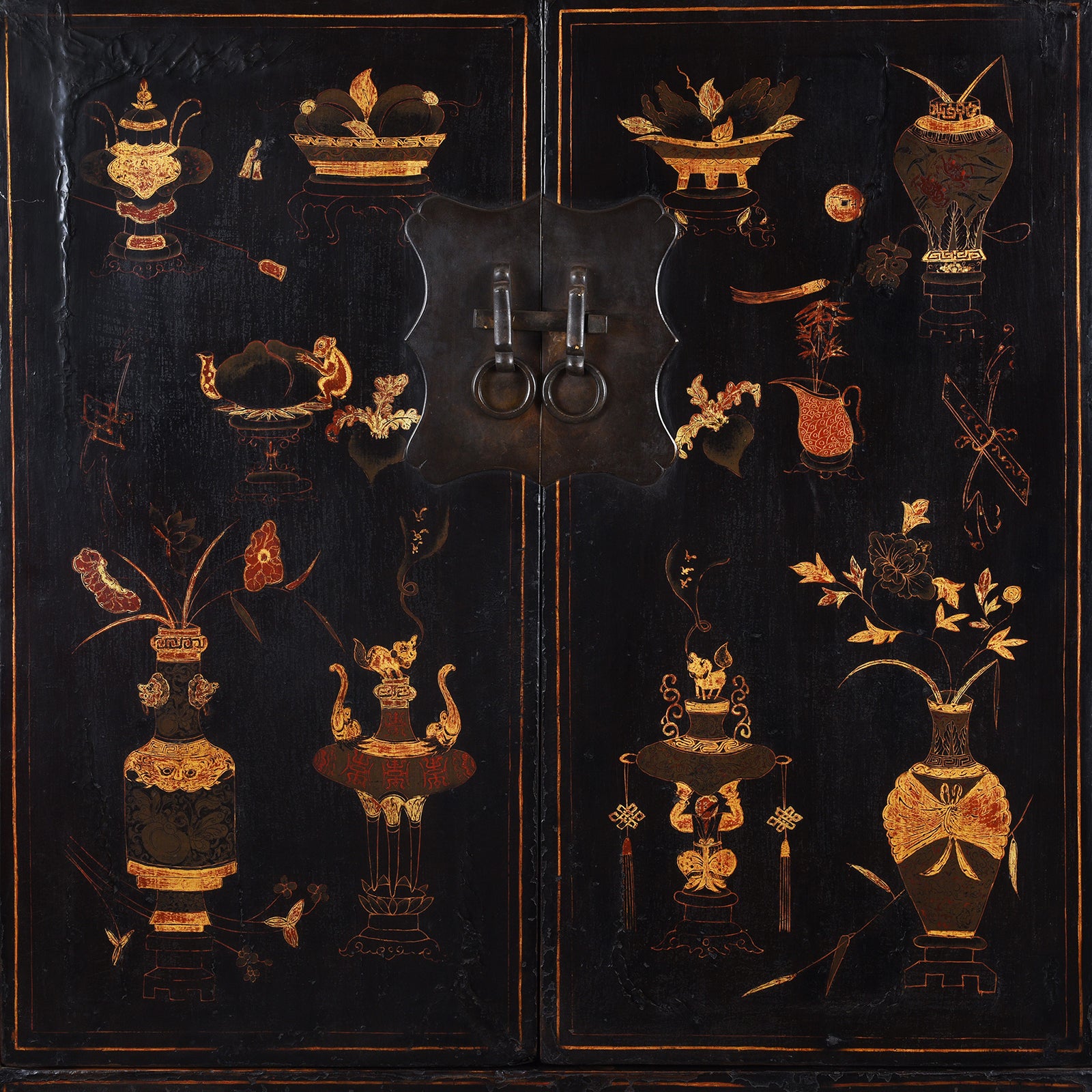 This style of cabinet, is referred to as a 'wedding cabinet' in The West. It would have been commissioned by a scholar, the decorative painted symbols believed to inspire intellectual thoughts. The term 'Wedding cabinet' is a farcical story created by antique dealers in The West. The doors are decorated with paintings of vases, ornaments and games boards while the frame of the cabinet displays repeating geometric patterns. There are humorous decorative details including a small animal clinging to fruit in a bowl.