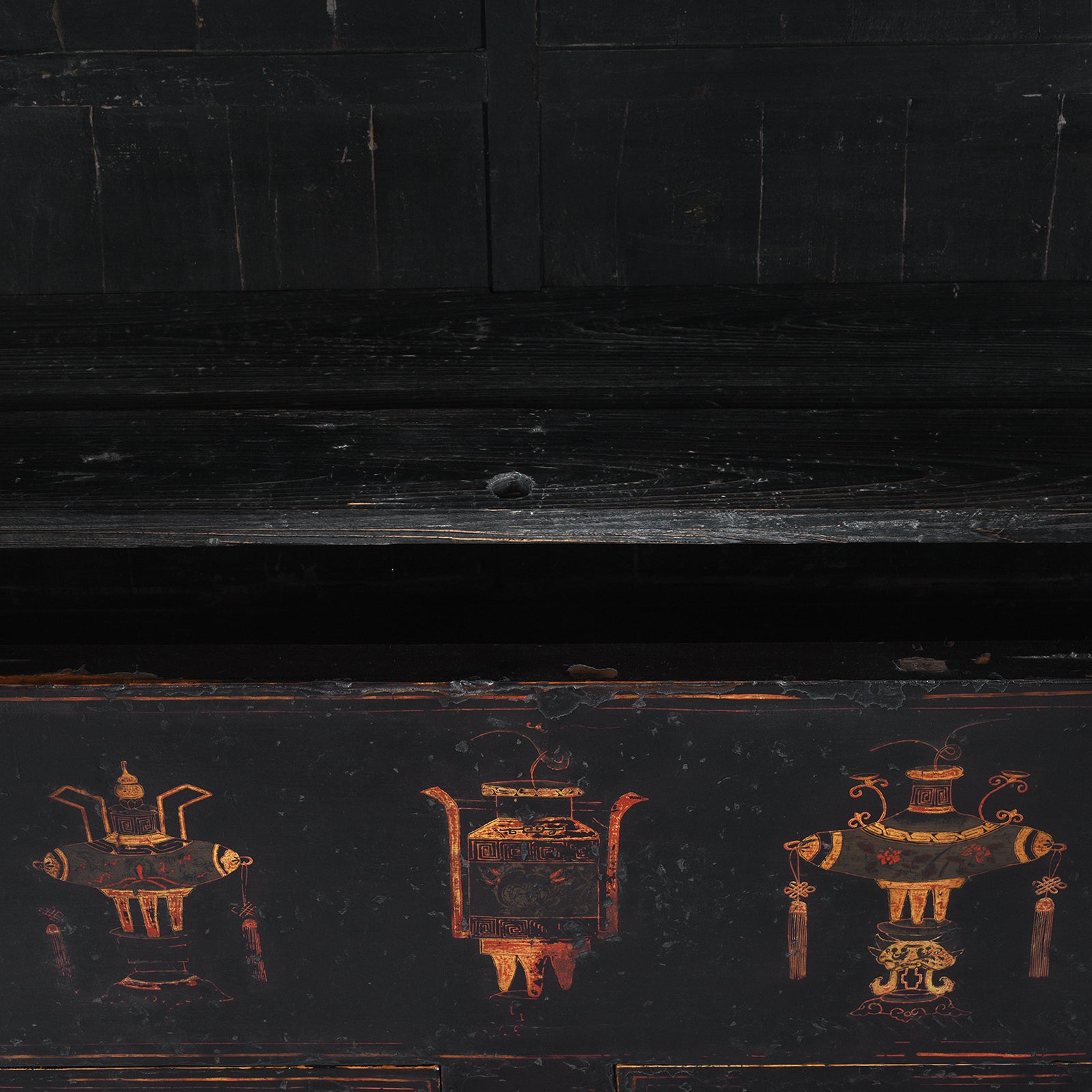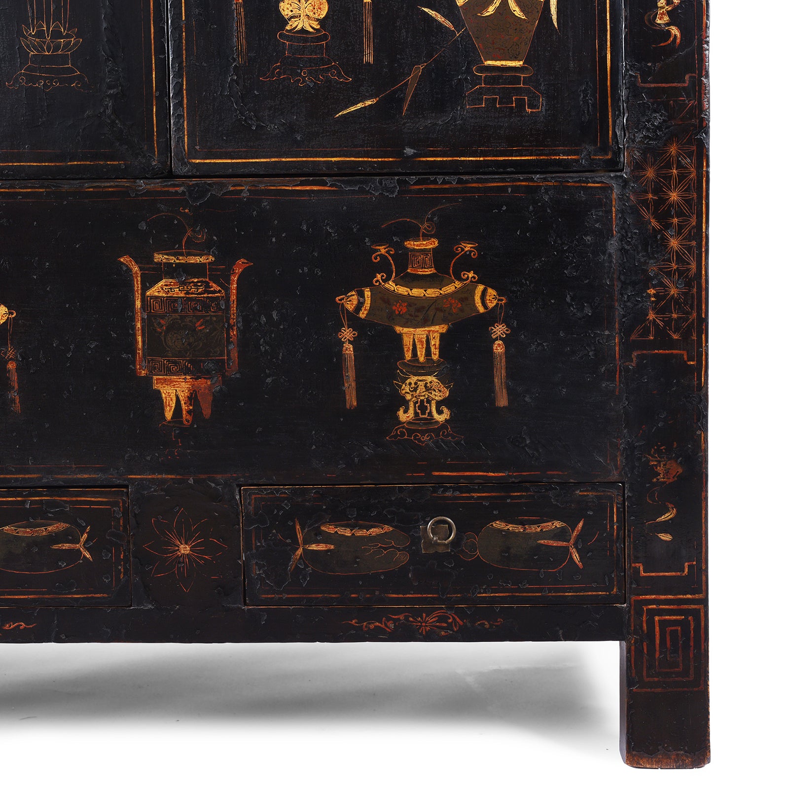 This dramatic antique Chinese black lacquer wedding cabinet would make a great centerpiece to any room. It dates to the 19th century, Qing dynasty (1644 - 1912) and is decorated with hand painted scholarly symbols. It is constructed from northern elm wood (yumu 榆木) and is from Shanxi province in Northern China.