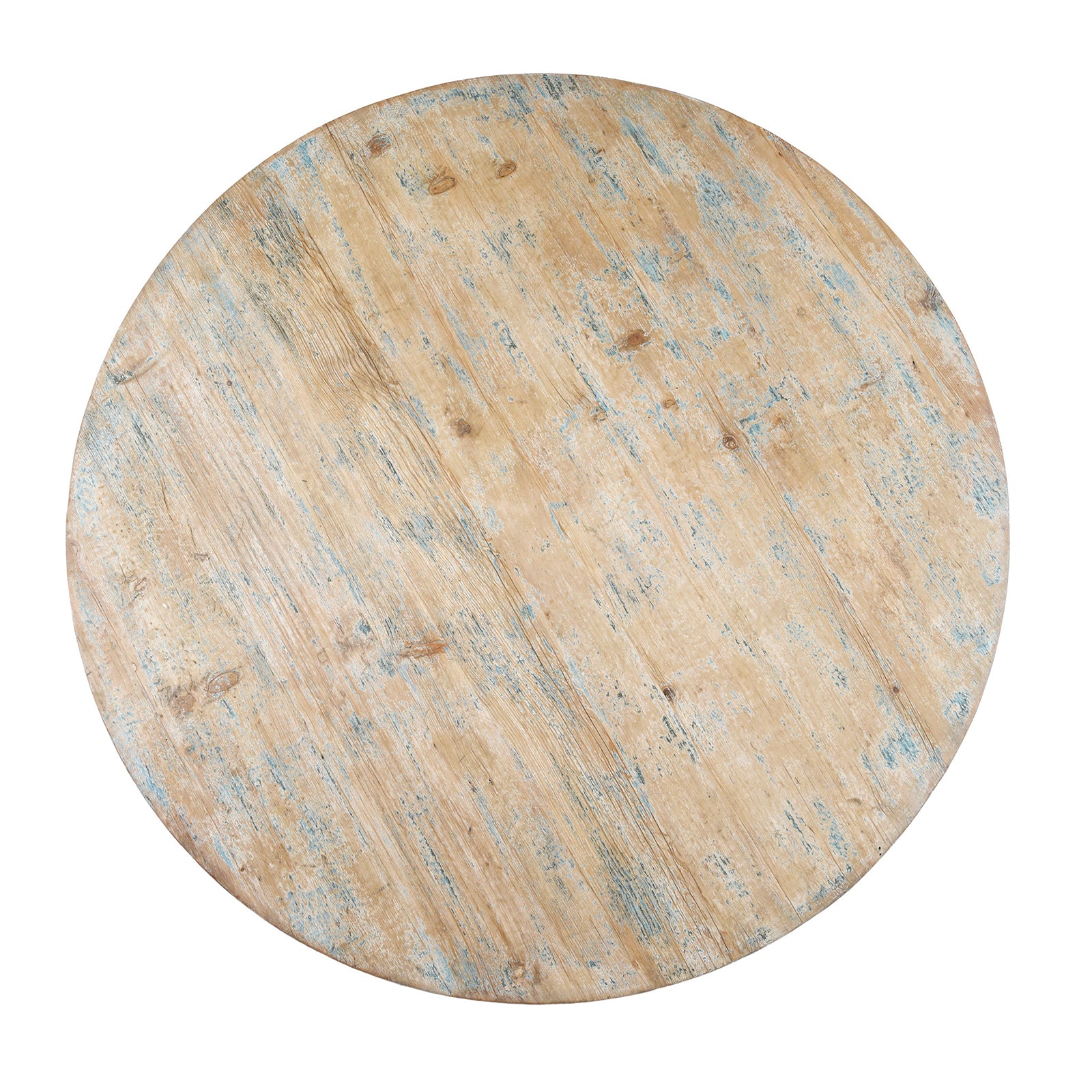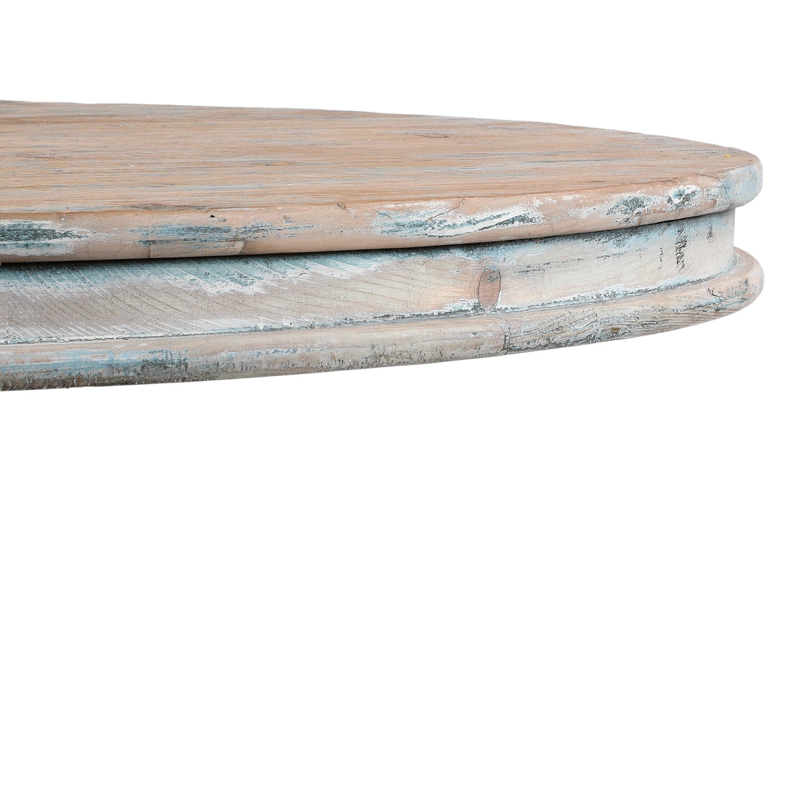 Crafted from reclaimed painted pine salvaged from historic Chinese buildings and boats, this round pedestal dining table brings both elegance and environmental integrity to the dining room. The soft, distressed blue finish evokes a coastal calm while highlighting the wood's unique history and patina. This is a softer finish than our standard blue painted tables